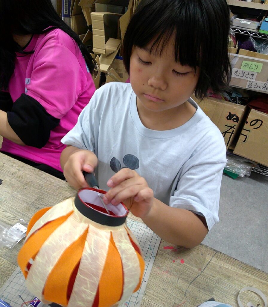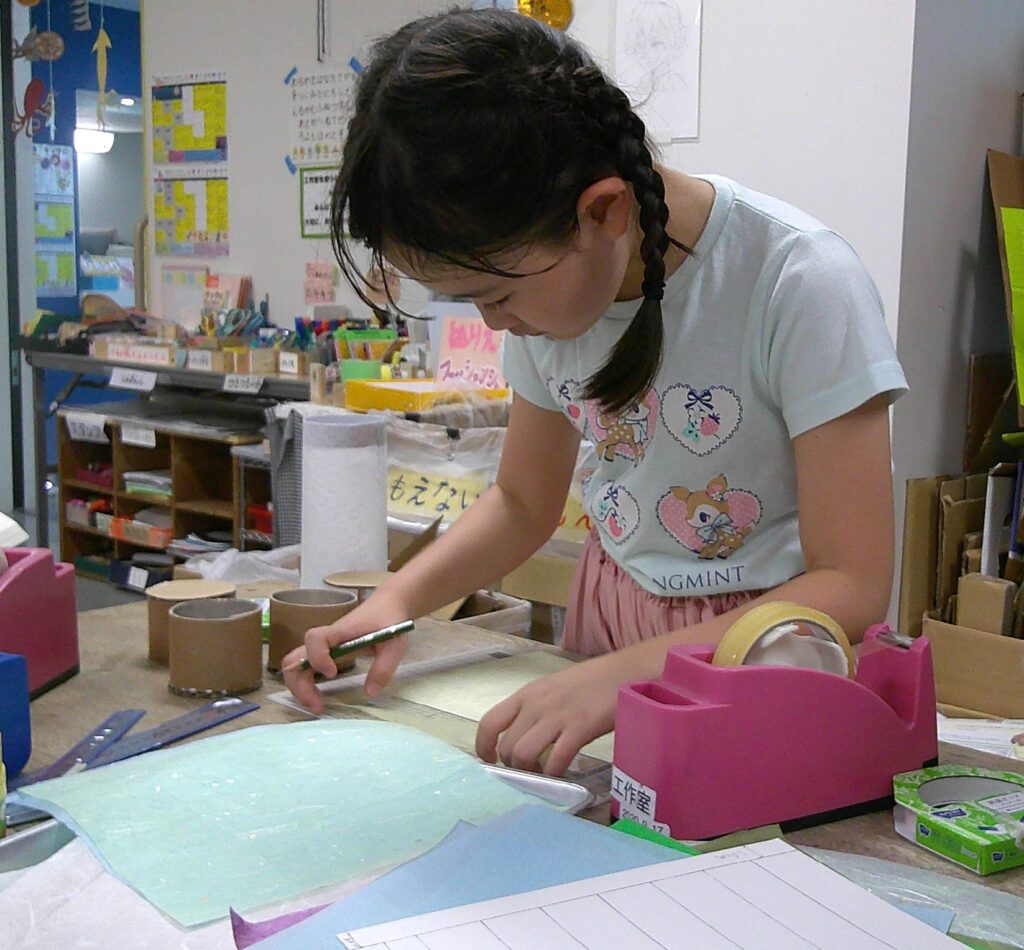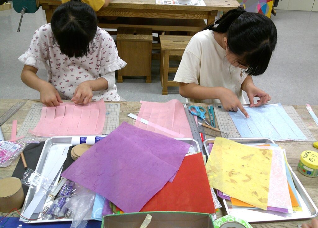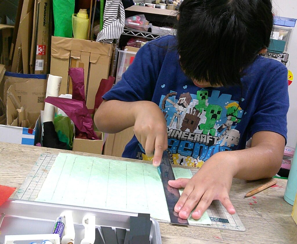 次にカッターと定規を使って、提灯の外側を作っていきました。初めは和紙の柔らかさや質感に戸惑いながらも、何度も切っていくうちに上手に切ることができました。定規で図った直線引きや、両面テープを使う等、細かい作業の連続でしたが、大事な工程なので、一つずつ丁寧に仕上げていきました。
