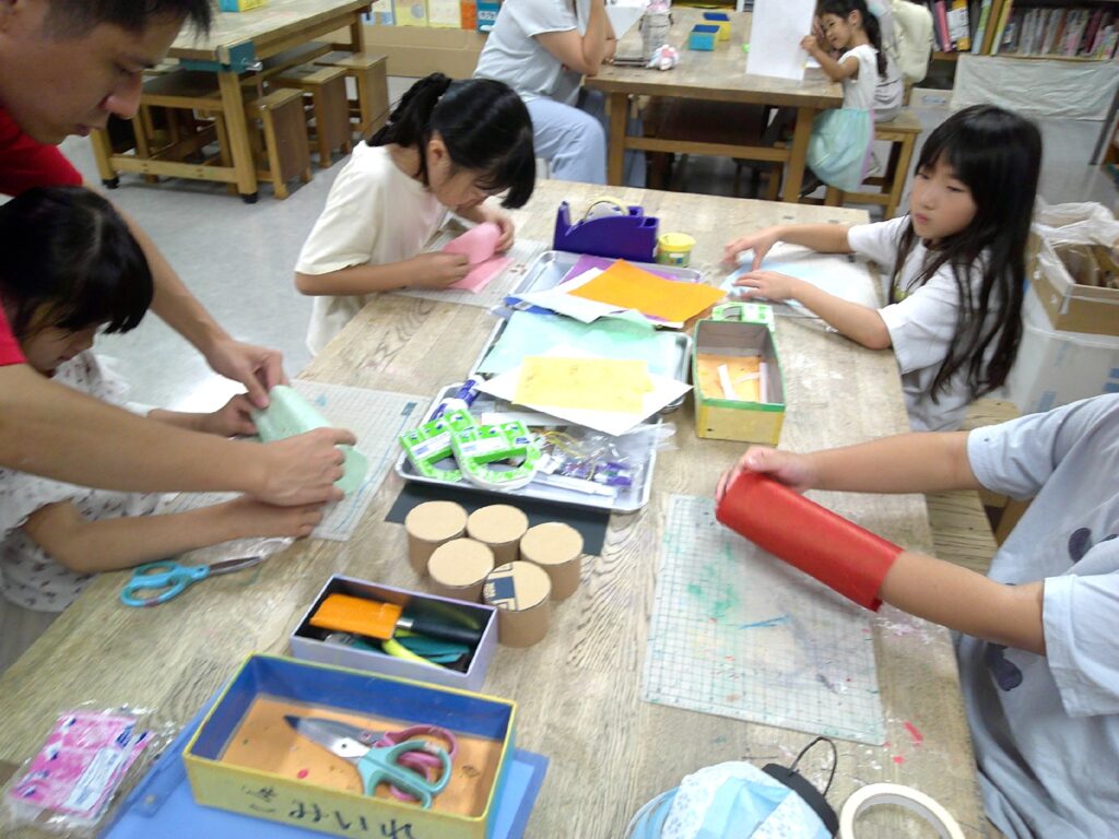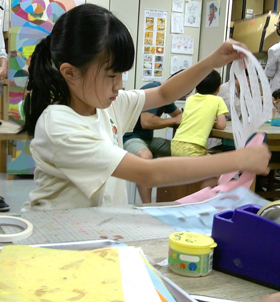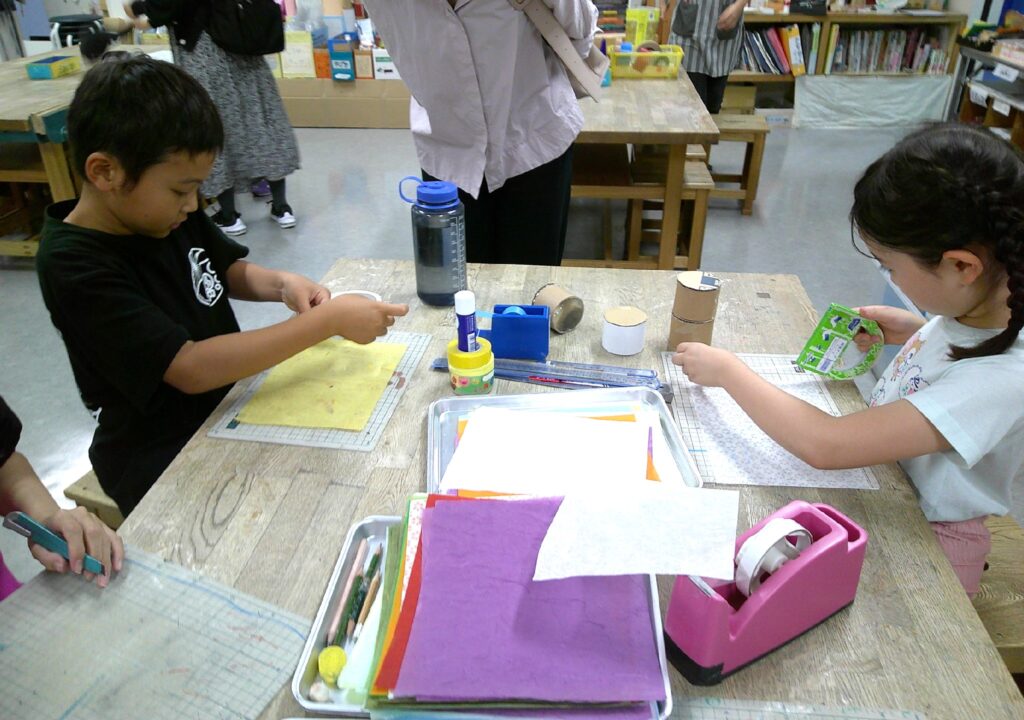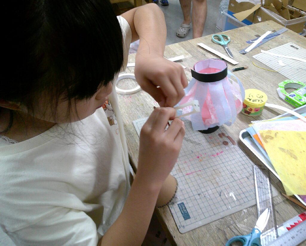 次にカッターと定規を使って、提灯の外側を作っていきました。初めは和紙の柔らかさや質感に戸惑いながらも、何度も切っていくうちに上手に切ることができました。定規で図った直線引きや、両面テープを使う等、細かい作業の連続でしたが、大事な工程なので、一つずつ丁寧に仕上げていきました。