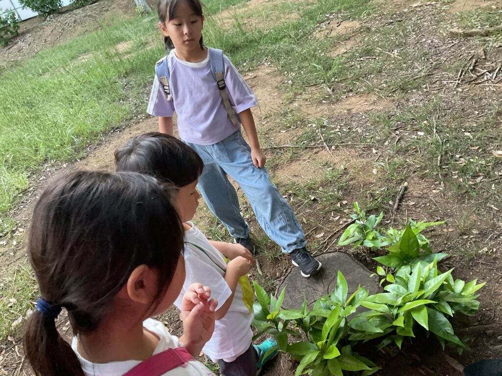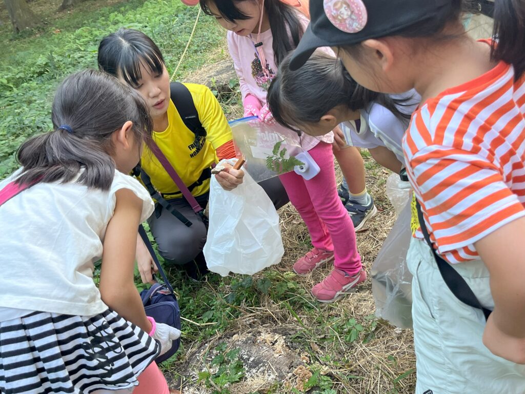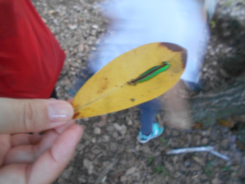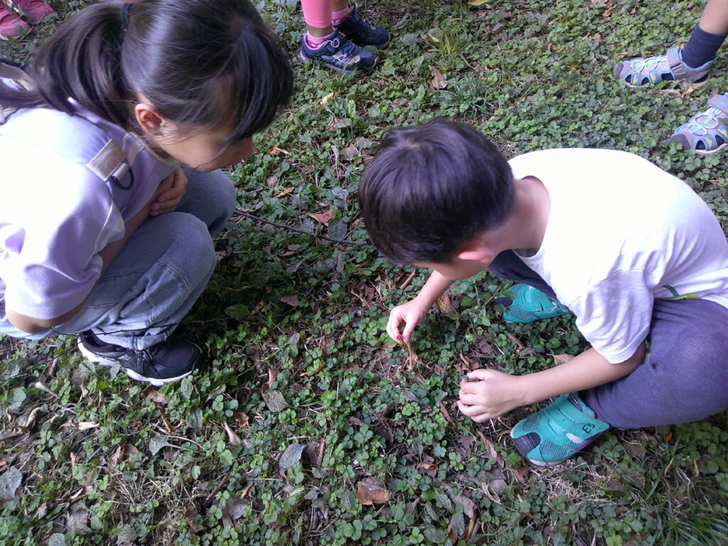 数歩歩く度に、ヘビイチゴやミツバ、カワラタケの仲間の生えた枝、株立ちのキノコ、輪になって生えるキノコ、サルノコシカケ、朽ち木、ショウリョウバッタ、エンマコオロギ、芋虫の死骸、カラスウリの葉、ヒル、四葉のカタバミ、ミズキの葉と実、スズメノカタビラ、タマムシの羽などなど、みんな次々に面白いものを見つけては知らせ合い、触ったり嗅いだりして進みました。