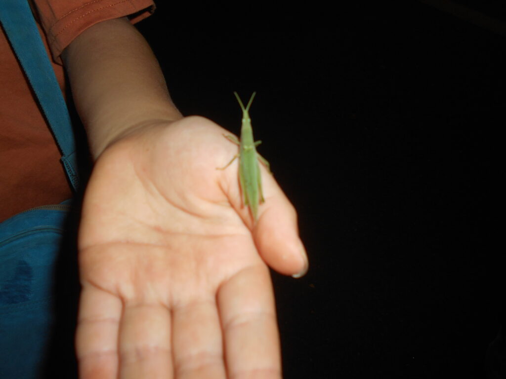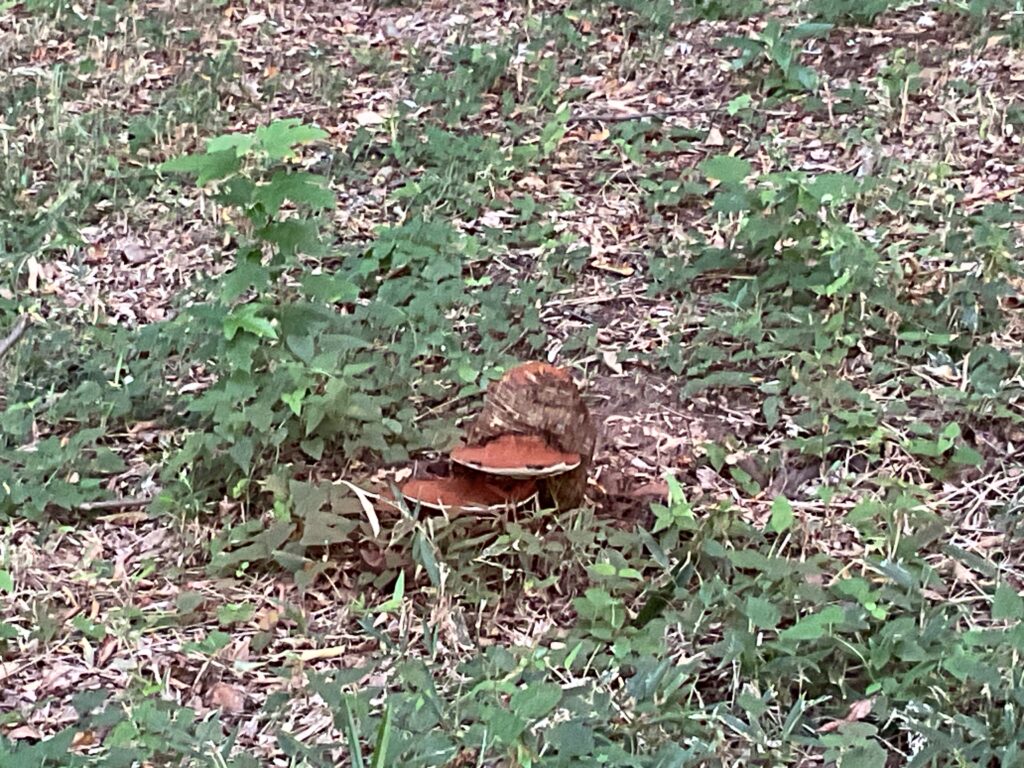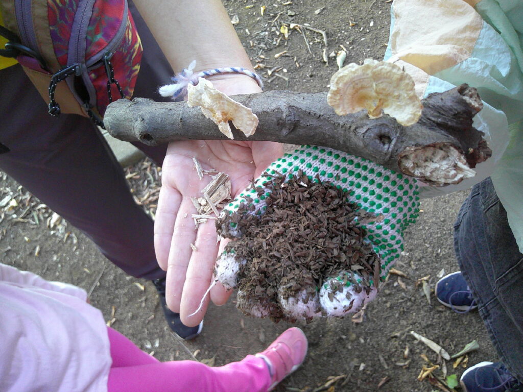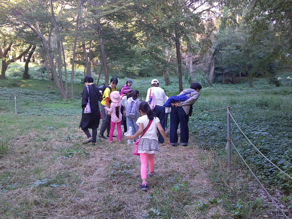 数歩歩く度に、ヘビイチゴやミツバ、カワラタケの仲間の生えた枝、株立ちのキノコ、輪になって生えるキノコ、サルノコシカケ、朽ち木、ショウリョウバッタ、エンマコオロギ、芋虫の死骸、カラスウリの葉、ヒル、四葉のカタバミ、ミズキの葉と実、スズメノカタビラ、タマムシの羽などなど、みんな次々に面白いものを見つけては知らせ合い、触ったり嗅いだりして進みました。