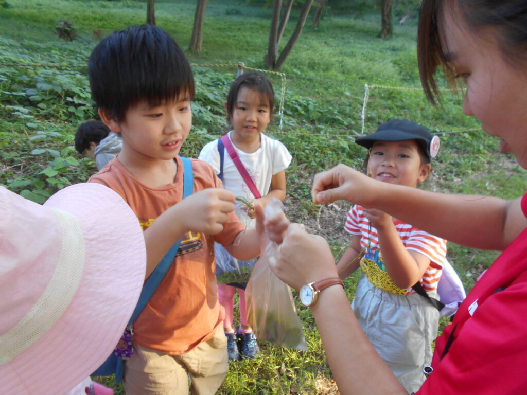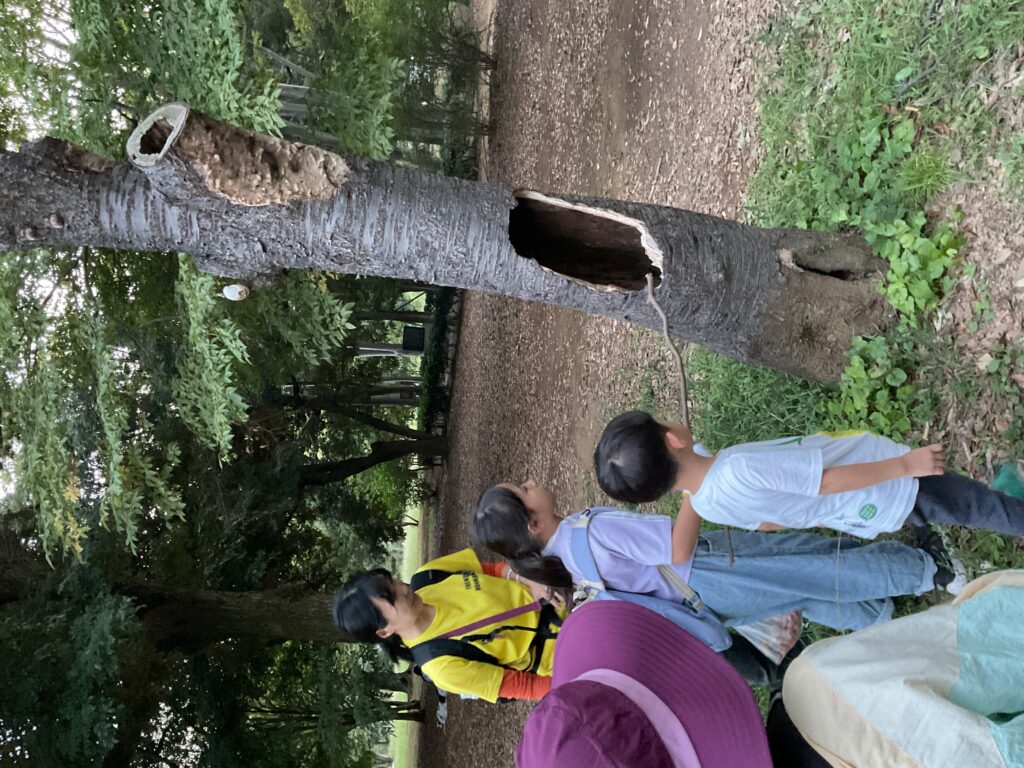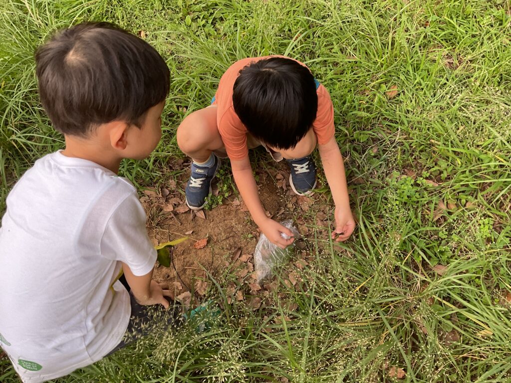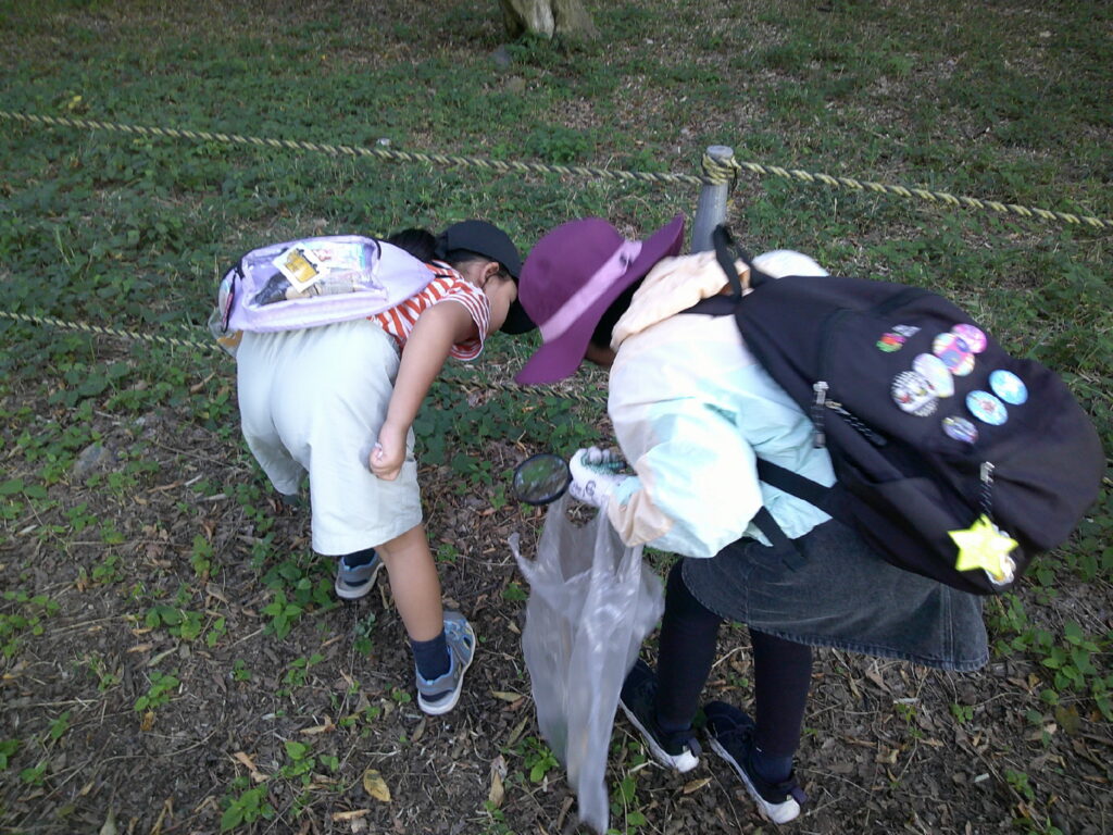 暗い林の中を少しドキドキしながらみんなで進み、終点の休憩所ではライトを灯しながらドングリゴマを作って遊びました。一時捕まえた生き物たちを「元気でいきるんだよ」と帰していました。