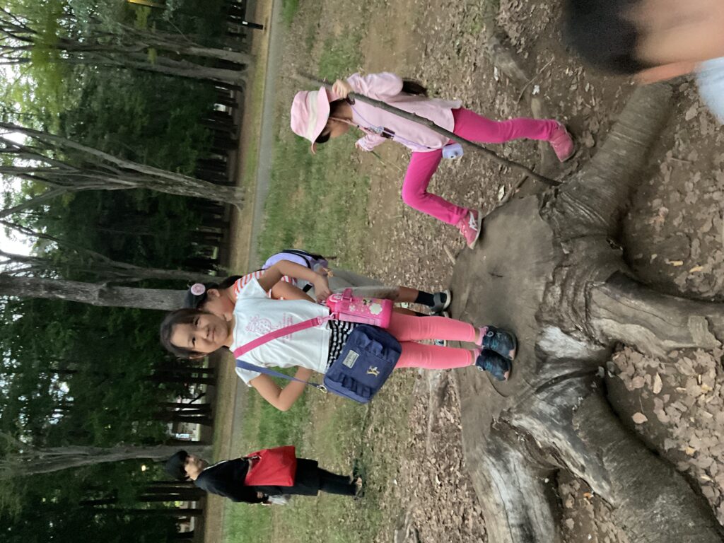 ときおり、草の茎の勝ち残り対決やマテバシイ飛行機飛ばし、葉っぱ笛などもして遊びました。そよぐ草波に「きれい~、写真撮って!」と記念撮影をしたり、大きな切り株に上ったり枝を拾って杖にしたり、「ドングリクッキー♪」とたくさんのマテバシイを拾い、木のウロ、松ぼっくり、ヤブツバキの実、謎の貝殻、固く植物が生えない地面やモグラの巣?、コナラの木、マテバシイのひこばえ更新など、目に見えるものすべてが面白いものばかりで、あっという間に暗くなってしまいました。