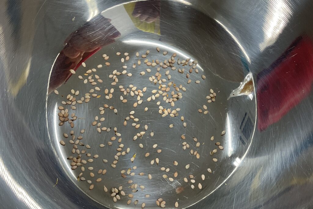 まずは、炊きたての新米を さくら餅のときのようについて、今年まいたタネから育てたゴマ(ほんの少し)と、昨年大豆のタネまき から作った美味しい 味噌 を合えた、甘味噌だれを作りました。積み重ねてきた楽しい体験が詰まった五平餅です。