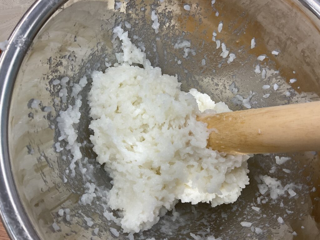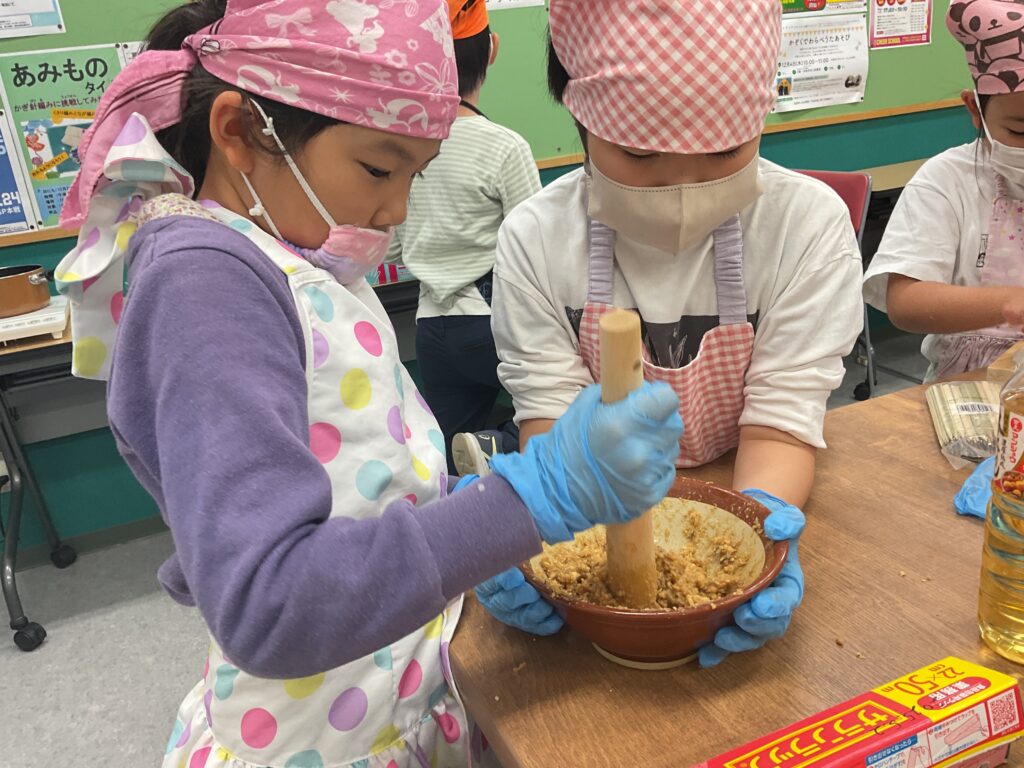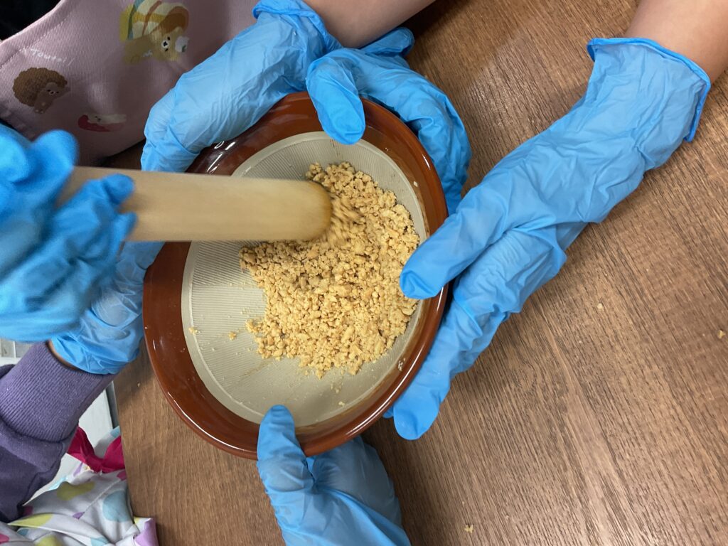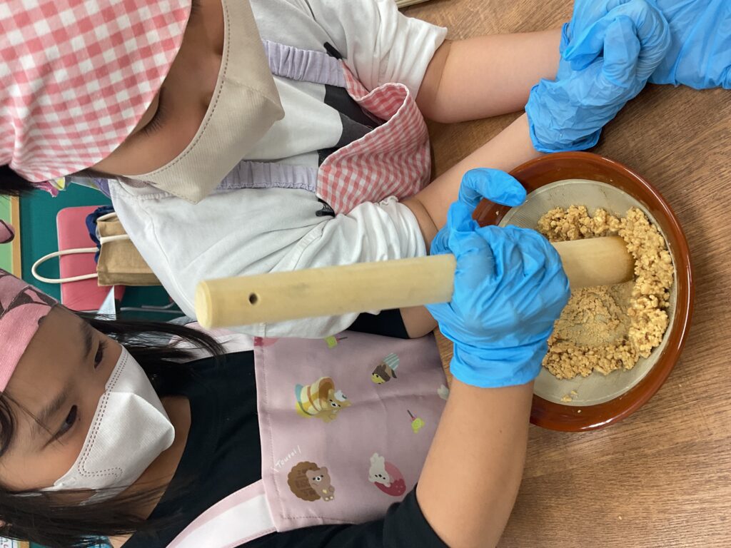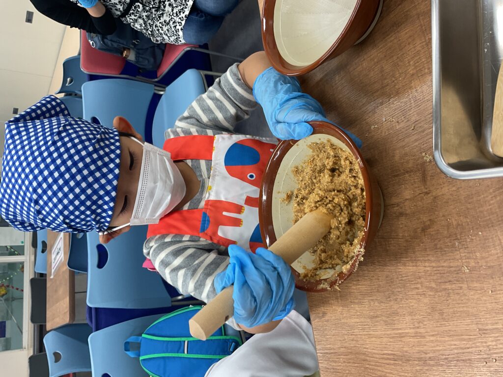 お米をつぶすのも力仕事。ゴマと落花生をペーストにするにもコツと根気がいりますが、つぶす感触やどんどん油が出て変化するのも面白い作業。「ふぅ」と汗がにじみながら、おいしくなるように交替してみんなでがんばりました!