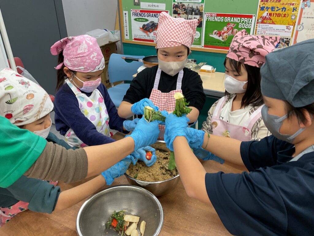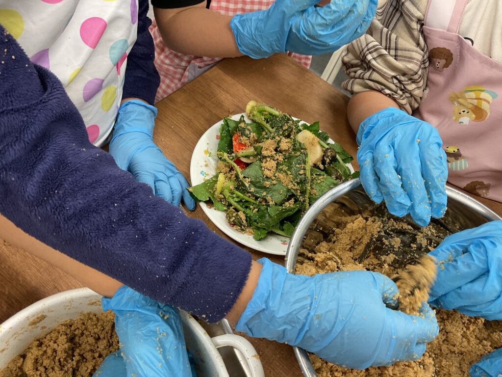 「ぬか食べてみたいな」「ぬか漬けしたあとのぬかは肥料にまいていいの?」など興味深々で、みんなで順番に作る工程を楽しみました。