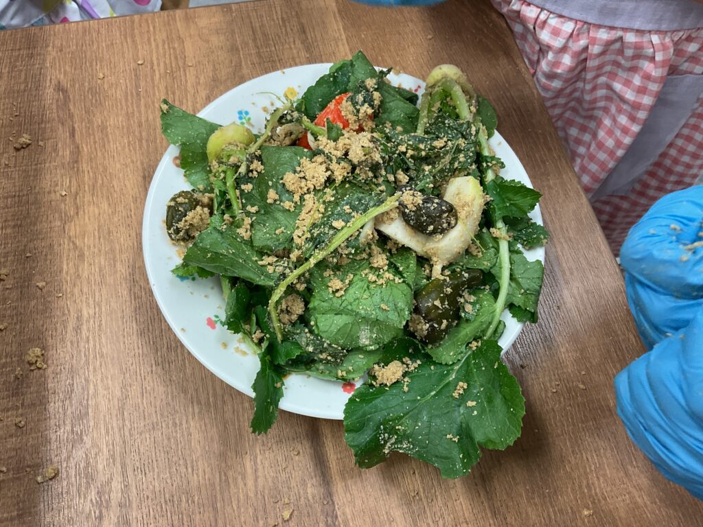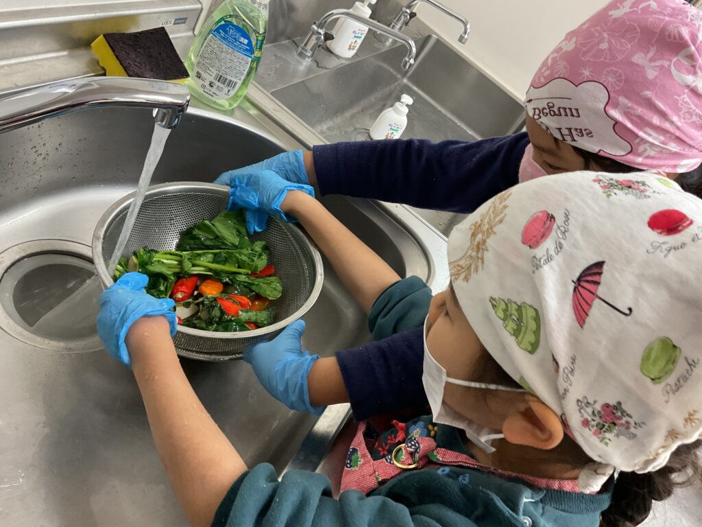 ぬか床づくり用にみんなでキムチトウガラシを収穫に行くと、こどもたちは熟した赤い色にうっとり。大根の葉と組み合わせて「新しい野菜♪」と見せ合っていました。