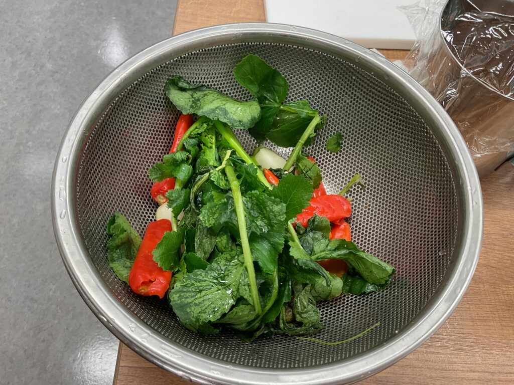 ぬか床からトウガラシ、ピーマン、大根、大根の葉を取り出し、水気を絞って洗うと、ぴかぴかツヤツヤの仕上がりになっていました!