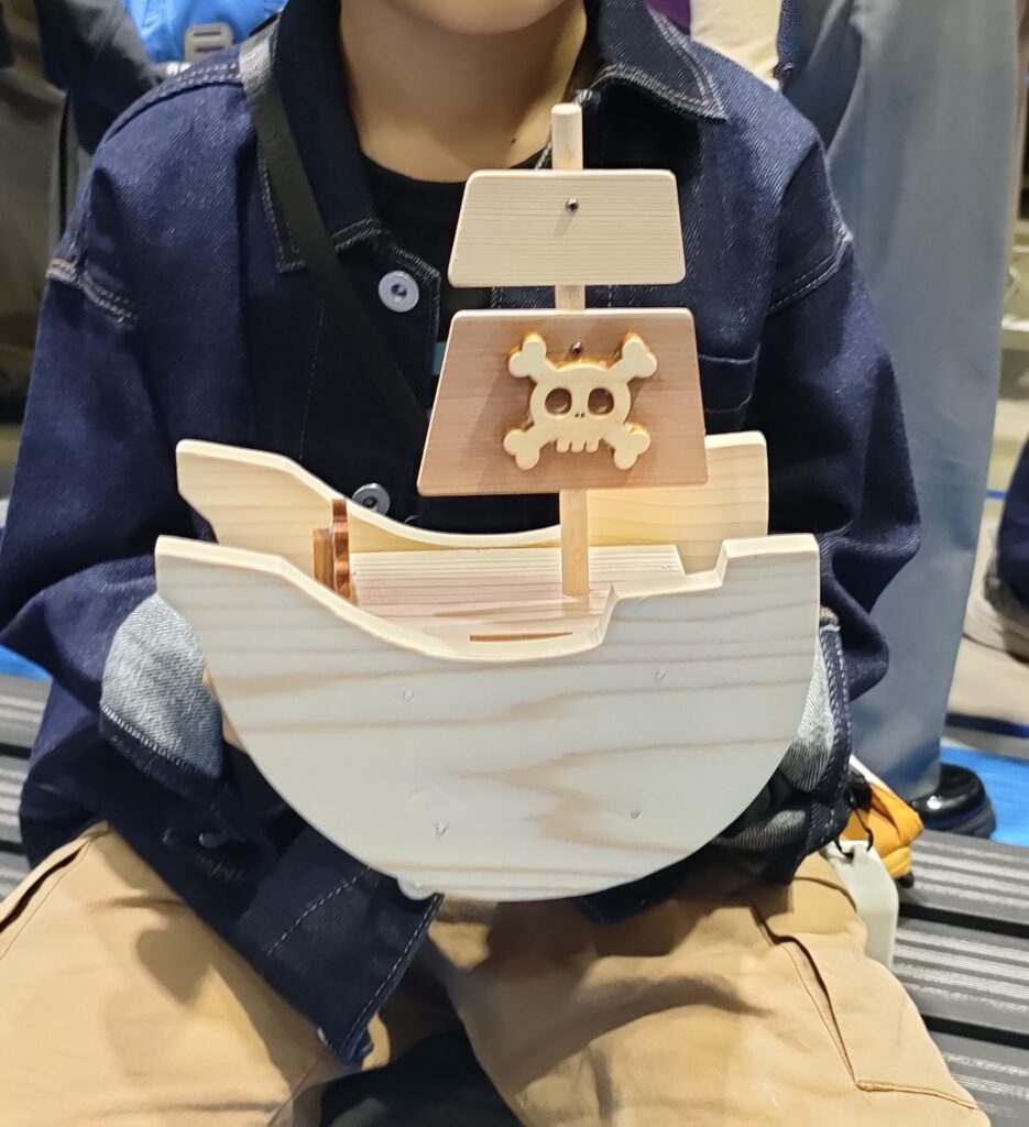 作品は「ペン立て」です。電動糸のこぎりでの手の込んだ細工にもトライし、ノコギリ、くぎ打ち、ニスぬりを経て、構想から3時間かけて作り上げました!