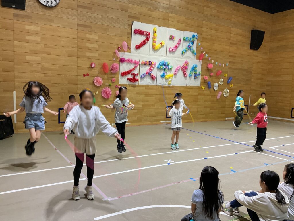 今月のフレンズカップは、1、2年生が対象のなわとび大会を行いました。30秒間で飛んだ回数に応じたポイントの合計点を競いました。種目は前飛び、後ろ飛び、片足飛びの3種目です。練習時間では得意な種目をたくさん練習していました。