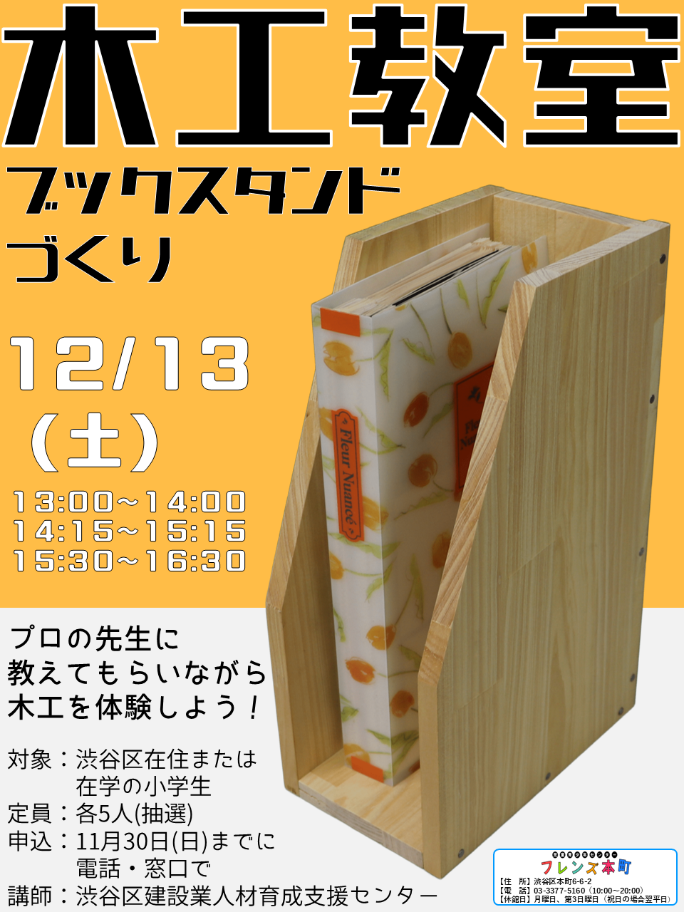 渋谷区/児童青少年センター フレンズ本町 > イベント > 2025年11月9日  木工教室「ブックスタンドづくり」🆕