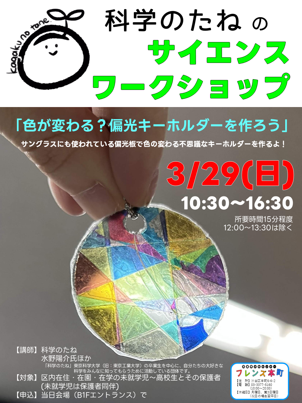 科学のたねのサイエンスワークショップ「色が変わる?偏光キーホルダーを作ろう」🆕