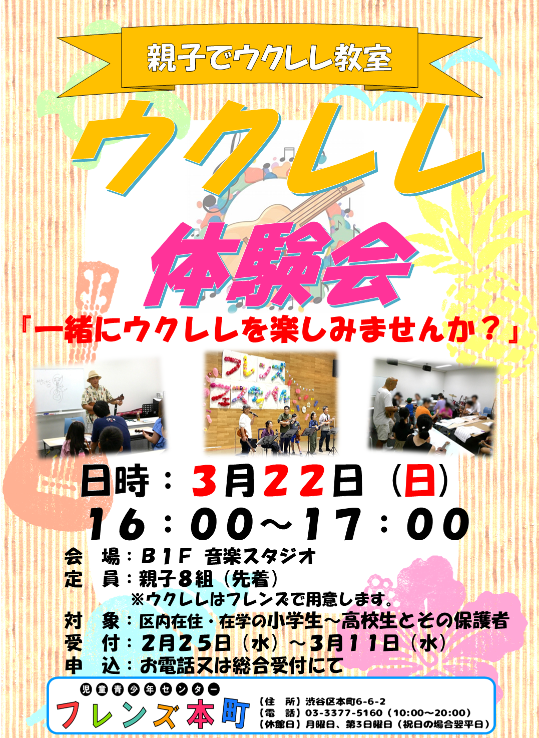 渋谷区/児童青少年センター フレンズ本町 > イベント > 2026年2月18日  親子でウクレレ教室🆕