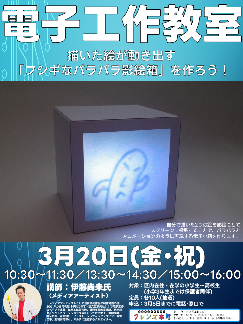 > 2026年2月21日 電子工作教室「描いた絵が動き出す「フシギなパラパラ影絵箱」を作ろう」🆕