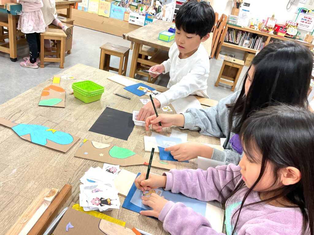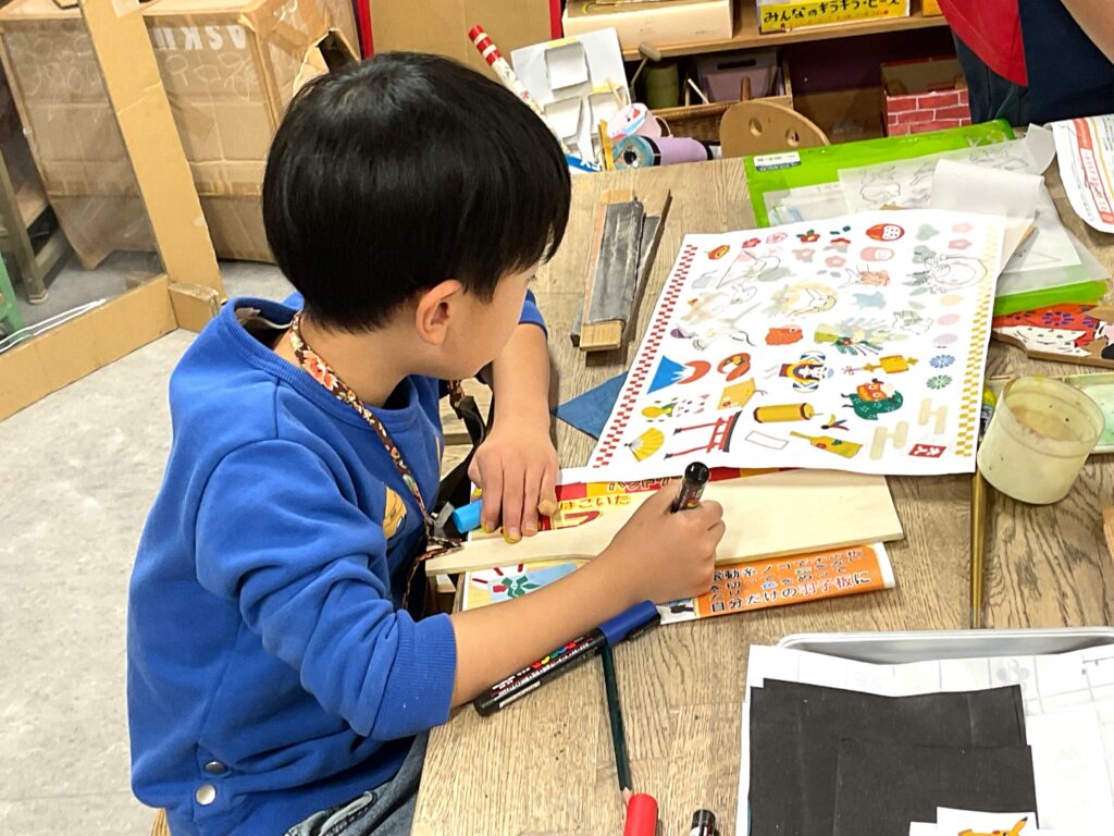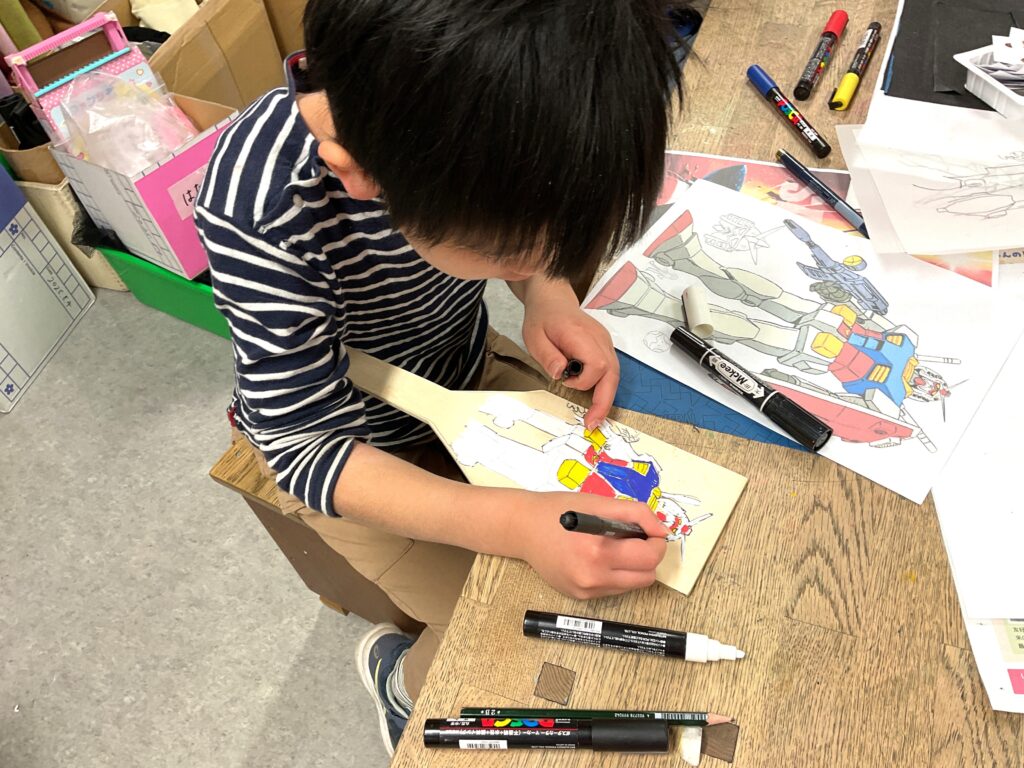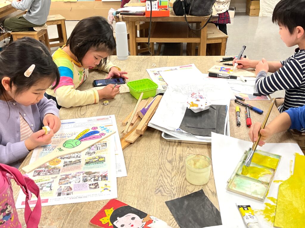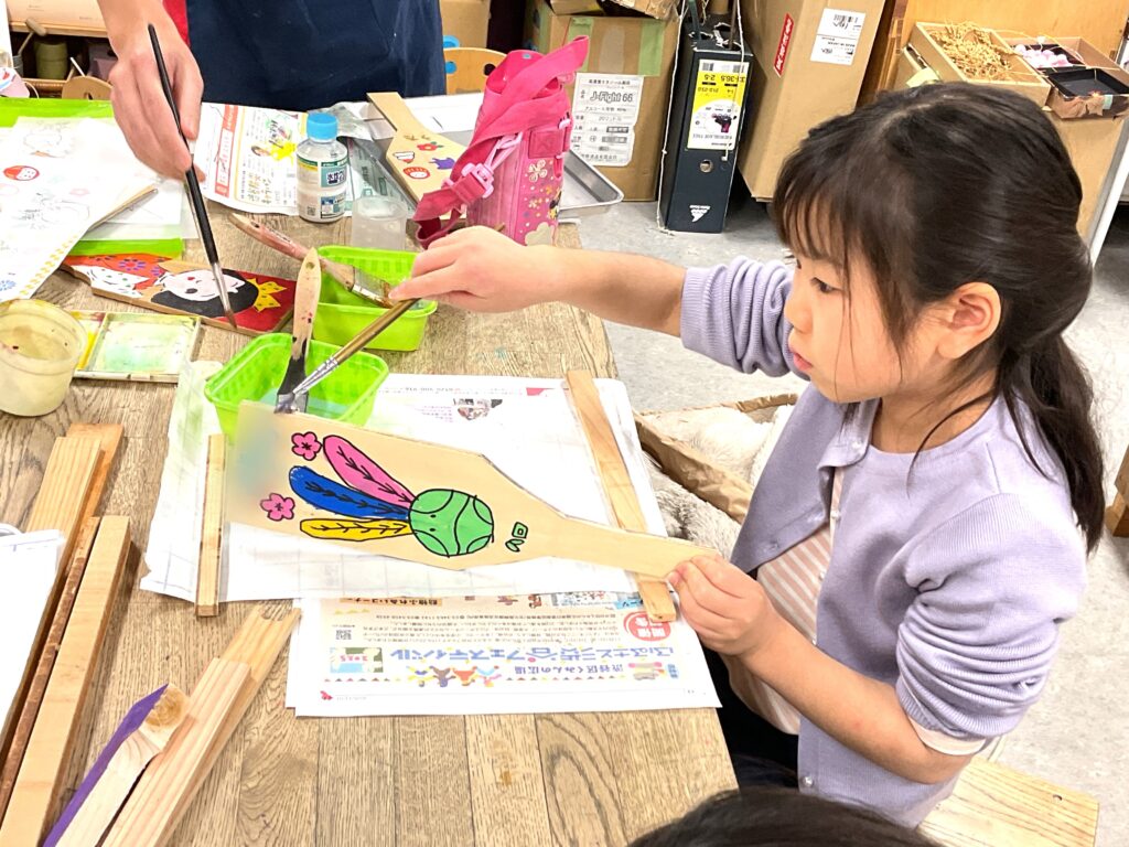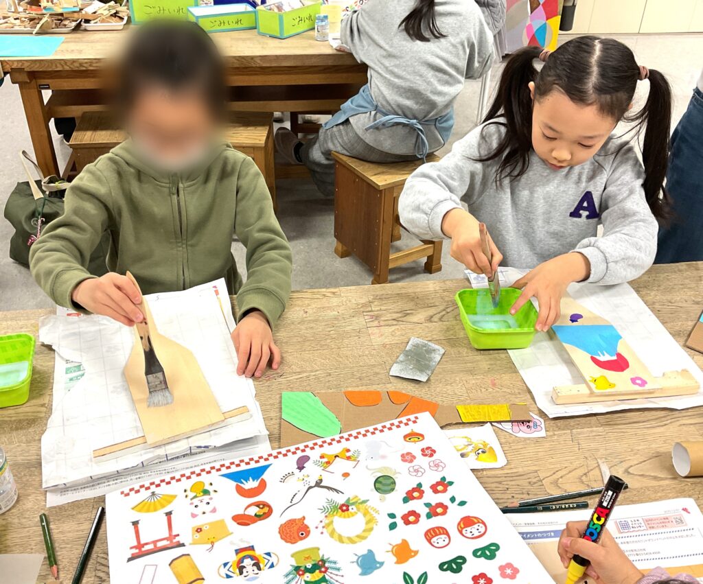 切り出しが終わったら色塗りに。お正月といえばこれ!のイラストを入れたり、好きなキャラクターを全面に描いたりと、デザインも凝って丁寧に作っていました。