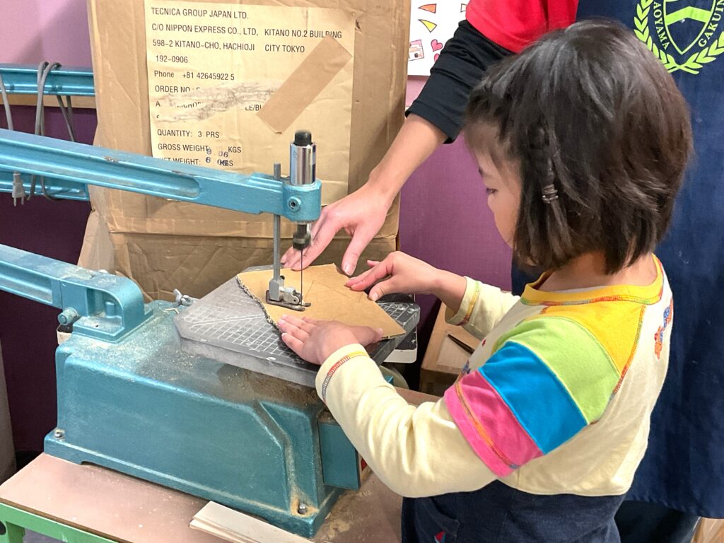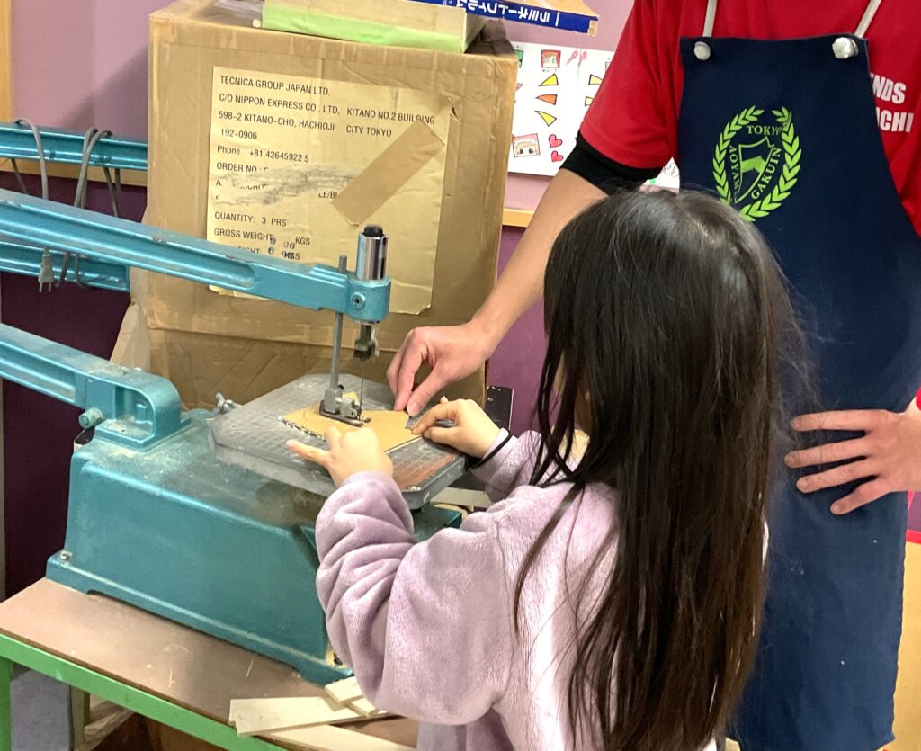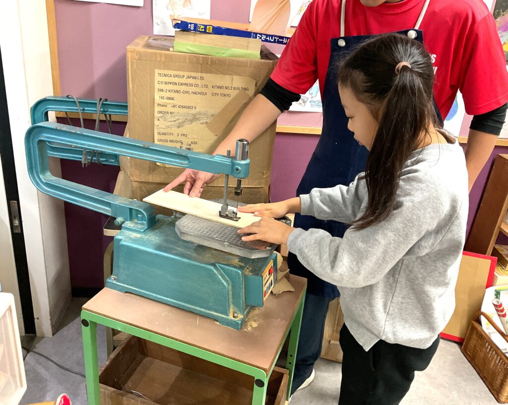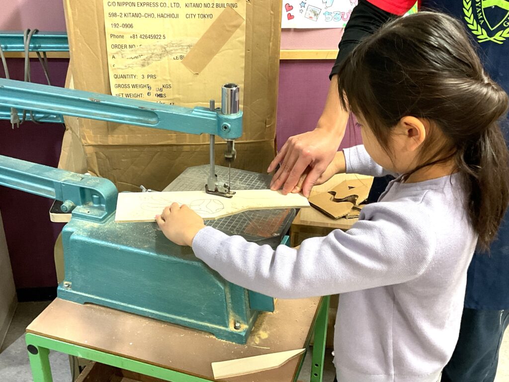 手に伝わる振動を感じながら慎重に切り出します。練習の甲斐もあって綺麗に切ることができました。「びっくりしたけど、綺麗にできた!」「楽しかった!」と自分で切った羽子板に目を輝かせていました。