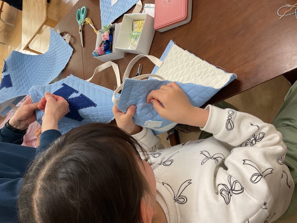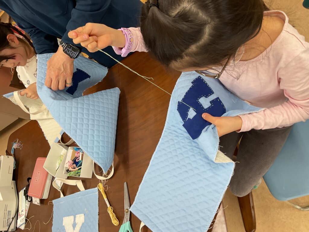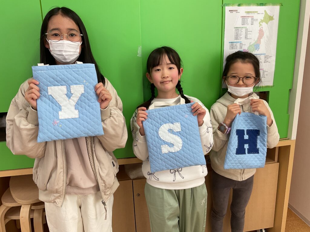 最後は自分のイニシャルとフランス刺繍のステッチでデザインしたバックを持って記念撮影です。さっそく月曜から学校に持って行くと言っているお友達もいました。オリジナルのバックで新学年を迎えてくれると嬉しいです。