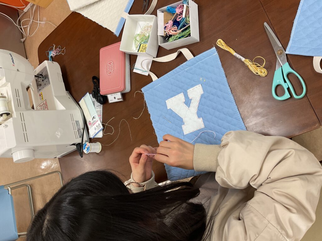 始めにキルト生地に自分のイニシャルをランニングステッチで留めていきます。みんな黙々と針を進めます。
