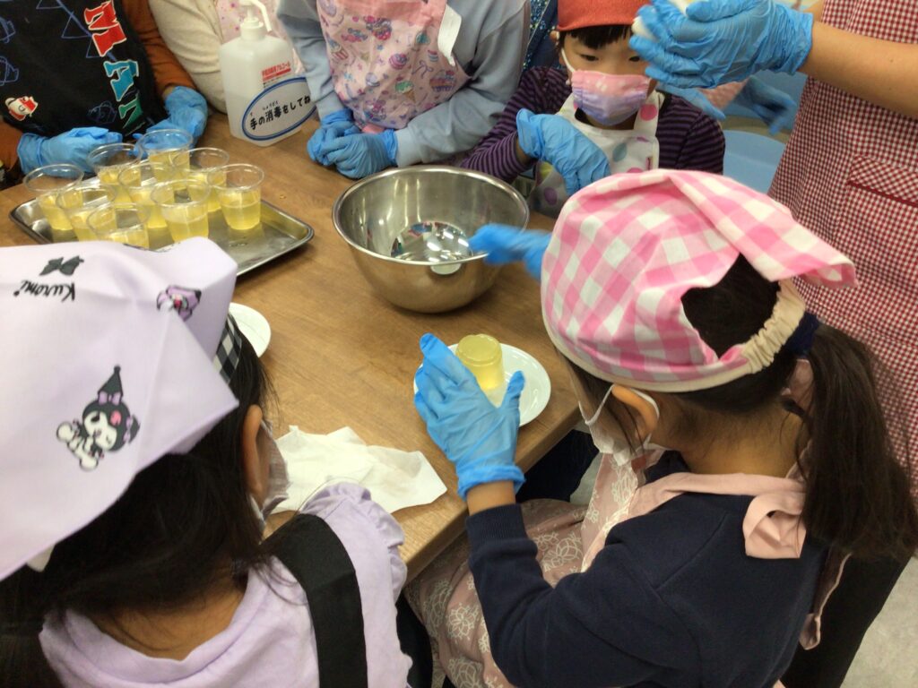 おまけの「梅ジュースの梅ゼリー」は、冷やし固めたカップを一瞬温めて中身を取り出す作業を「自分でやりたい!」と楽しんでいました。