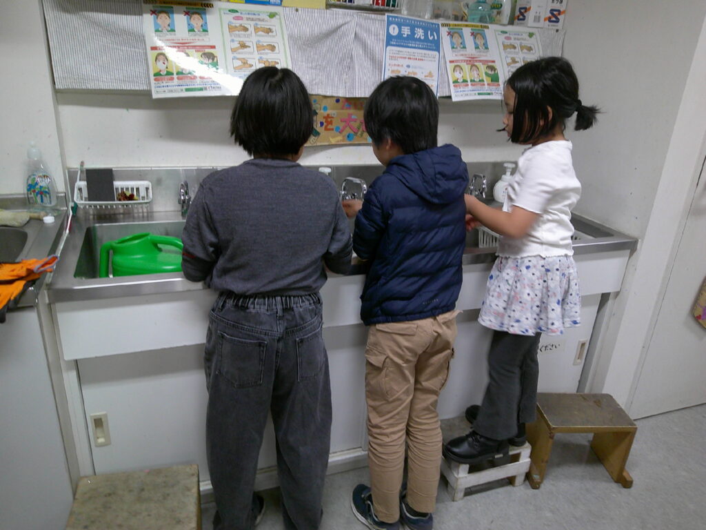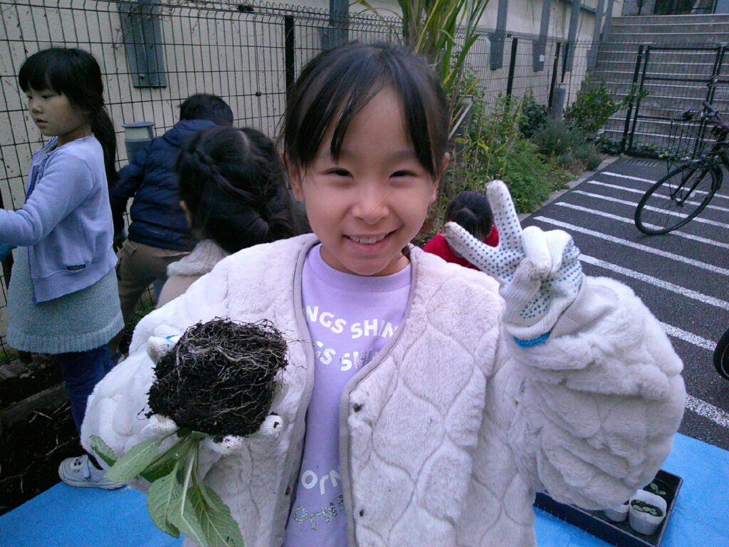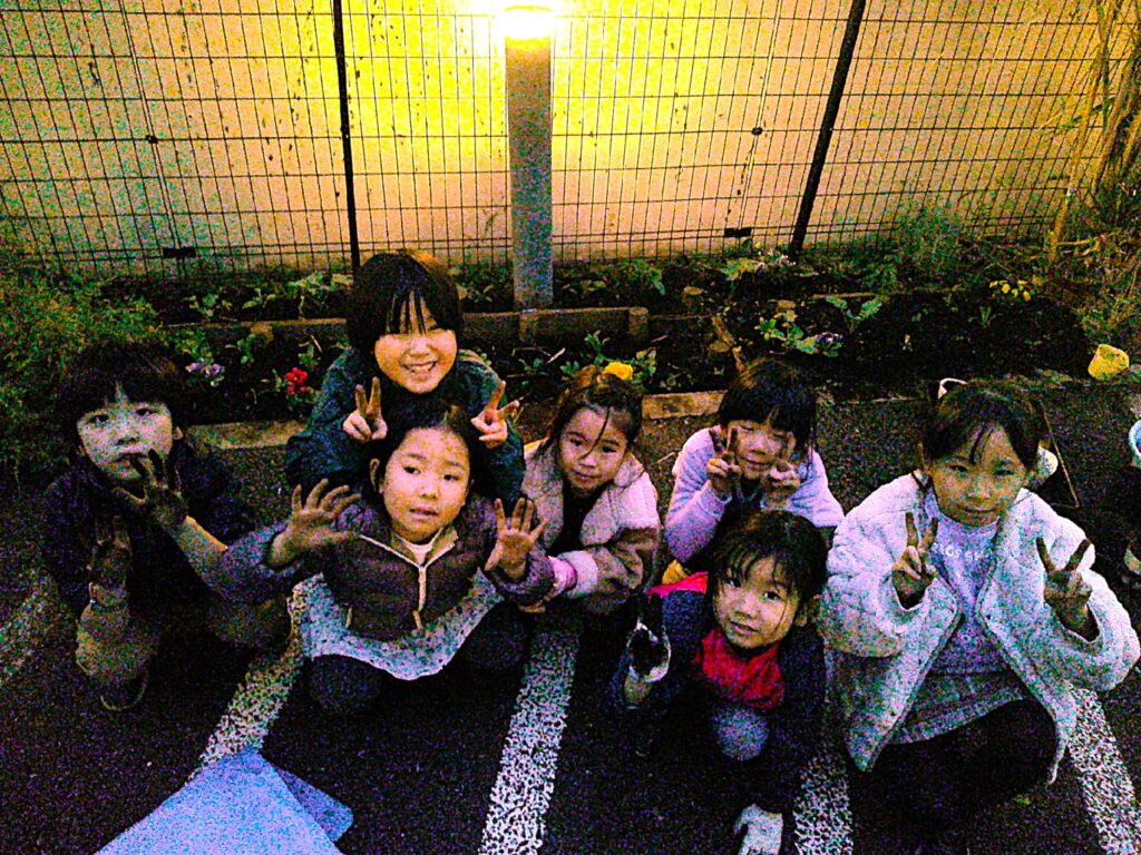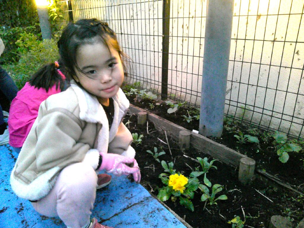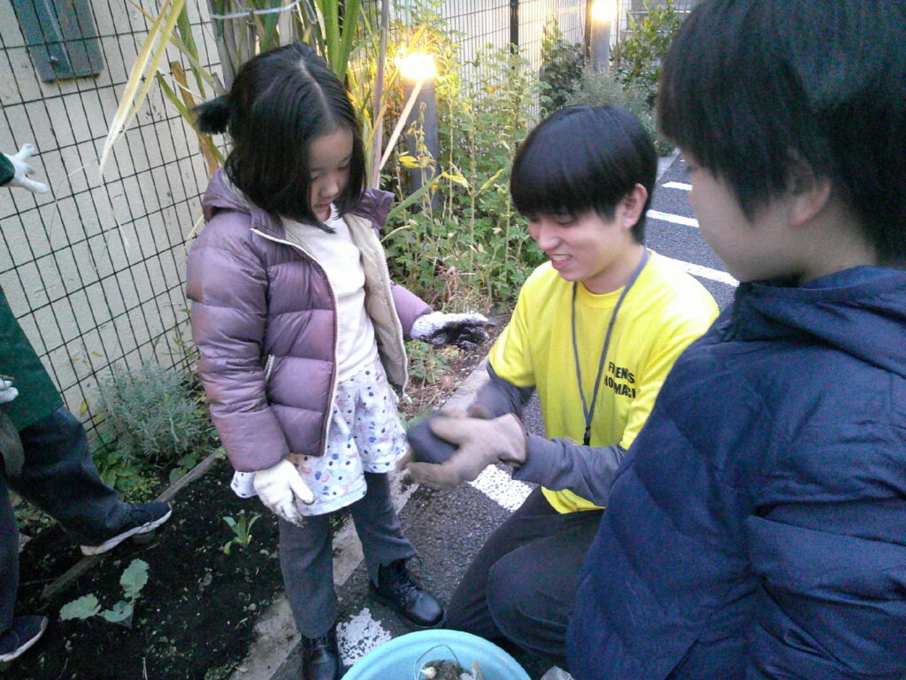 11月の夕暮れ時の土は冷たいですが、作業中は途中から「素手がいい!」と軍手を外す様子や、大学の実習生や初挑戦のお友達に苗の植え方を教えてあげる場面もありました。