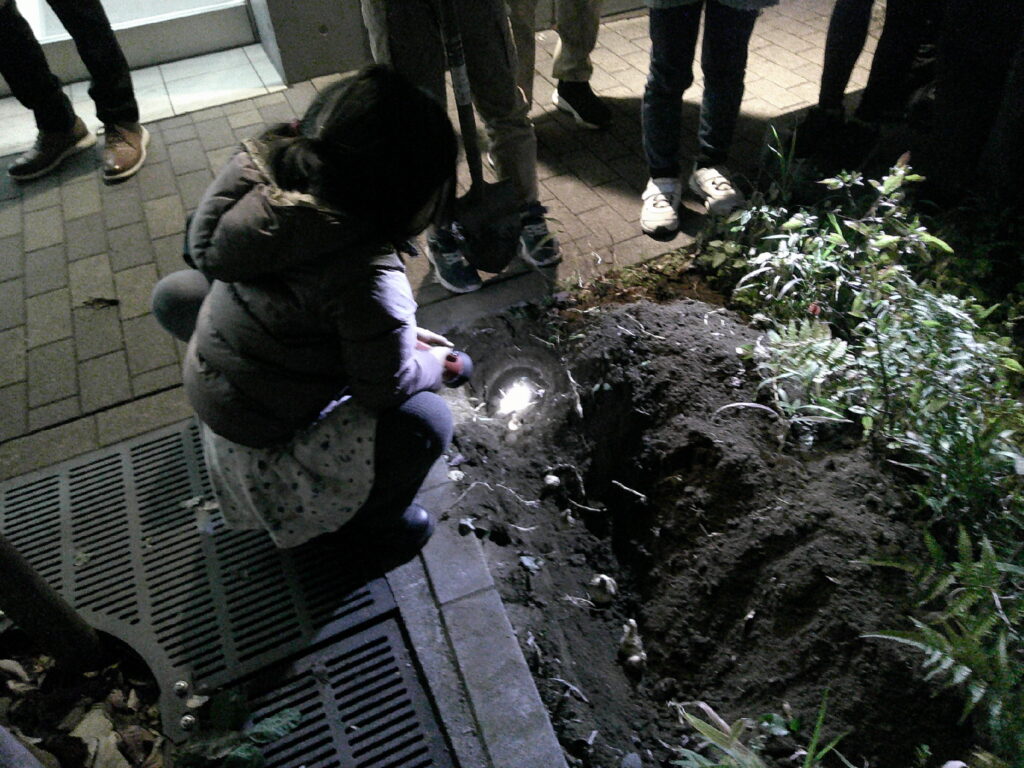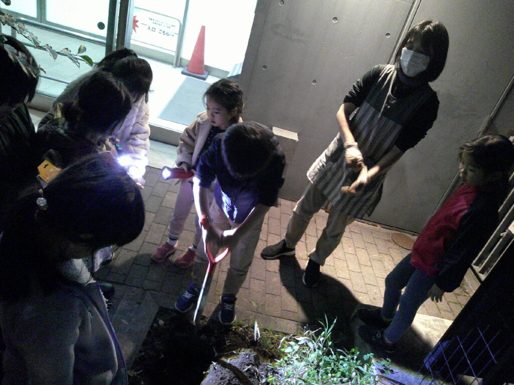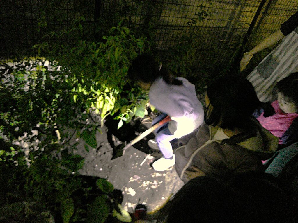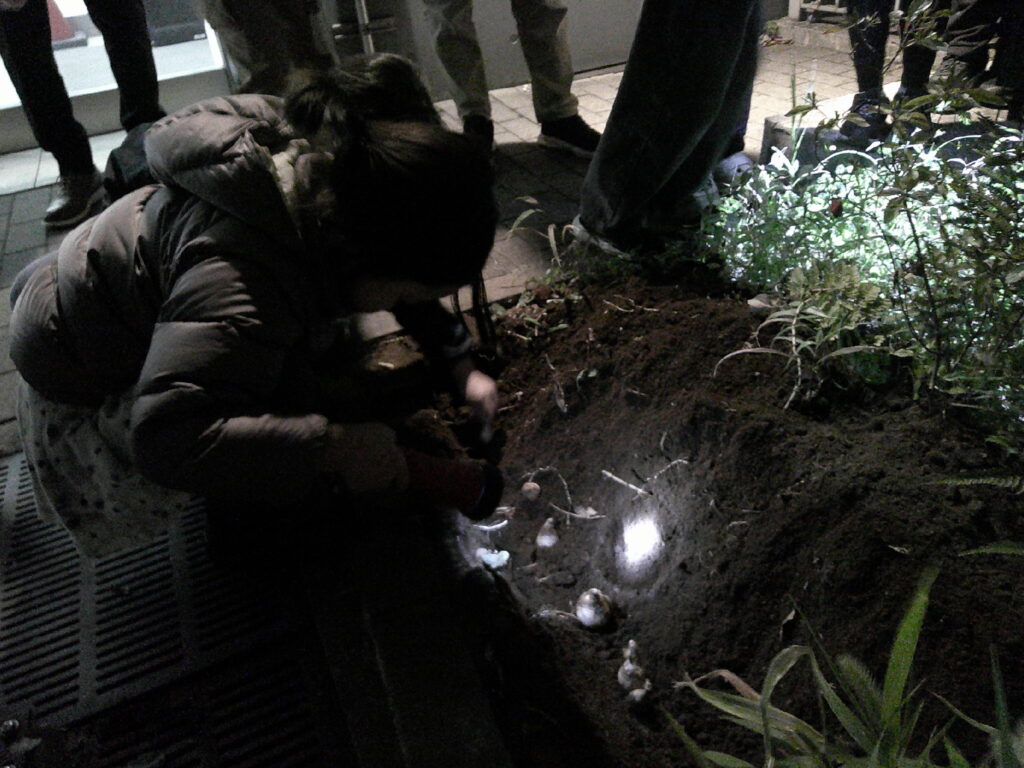 日没直後のうす暗い中をライトで照らして気をつけつつ、スコップでの穴掘りや移植、スイセンの球根植えを楽しみました。