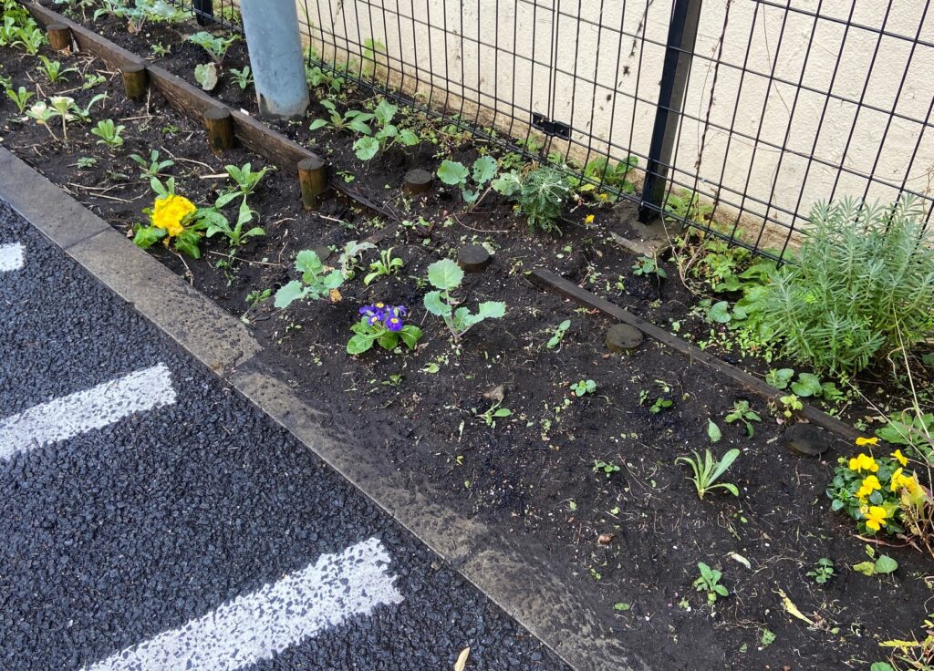 まだ小さなカレンデュラ、スミレ、のらぼう菜、ペインテッドセージなどが、 こどもたちだけの手できれいに植えられています。