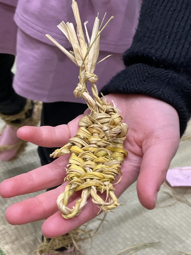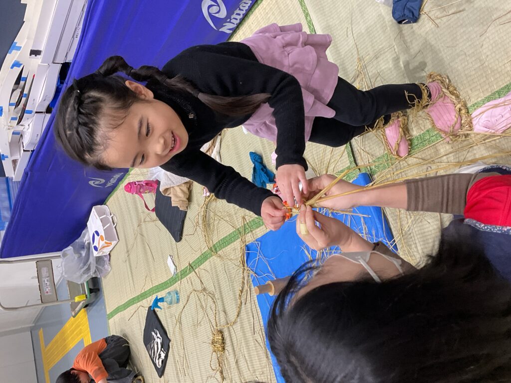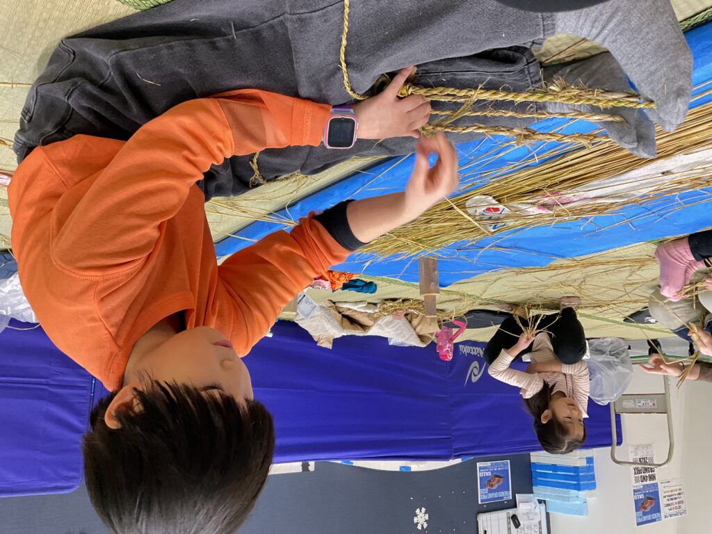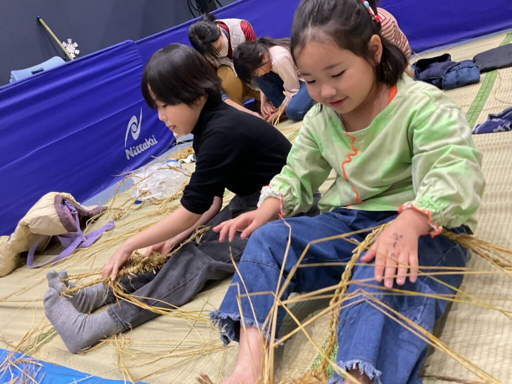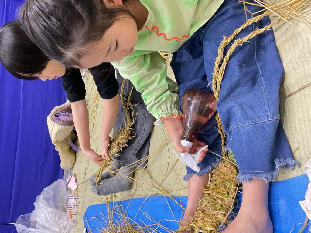 「わらじのじかん」は今回で3回目。昨年よりも「なわない」がとても上手になり、切れにくい丈夫な縄ができたので良い出来になりそう!「見て!もう身長の長さ!」と楽しみながらできました。
