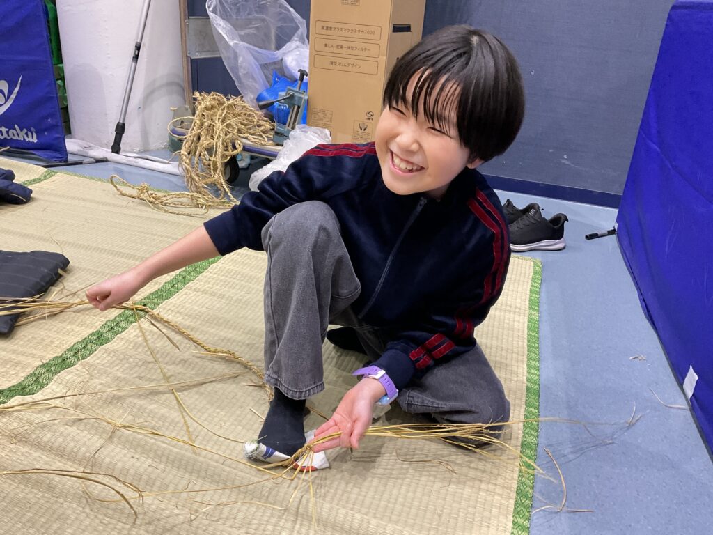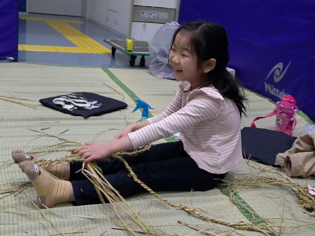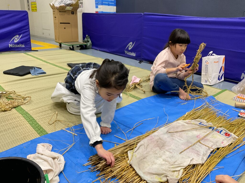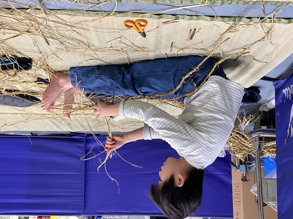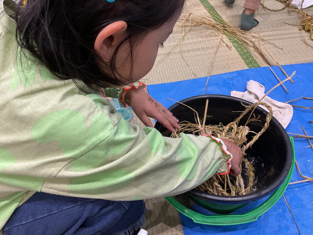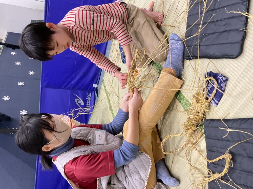 「わらじのじかん」は今回で3回目。昨年よりも「なわない」がとても上手になり、切れにくい丈夫な縄ができたので良い出来になりそう!「見て!もう身長の長さ!」と楽しみながらできました。