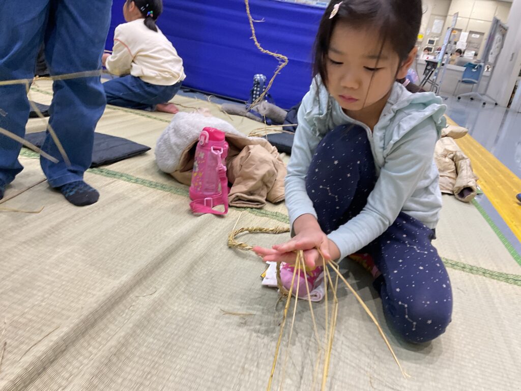 片足、両足を完成した人が続々。できた紐をなわとびにして遊ぶ姿もありました。参加したこどもたちは「みどりのじかん」で一緒に活動してきた仲間同士なのでとても仲良く連帯感があり、励まし合って楽しく作業を進めています。