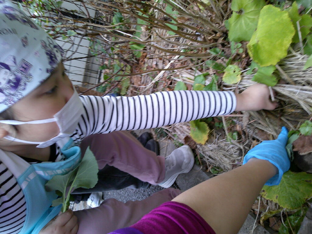 のらぼうの他、ふりかけ用の大根っ葉や、来月の「お花のデザート」で使用する花、そして出始めたフキノトウを摘みました。