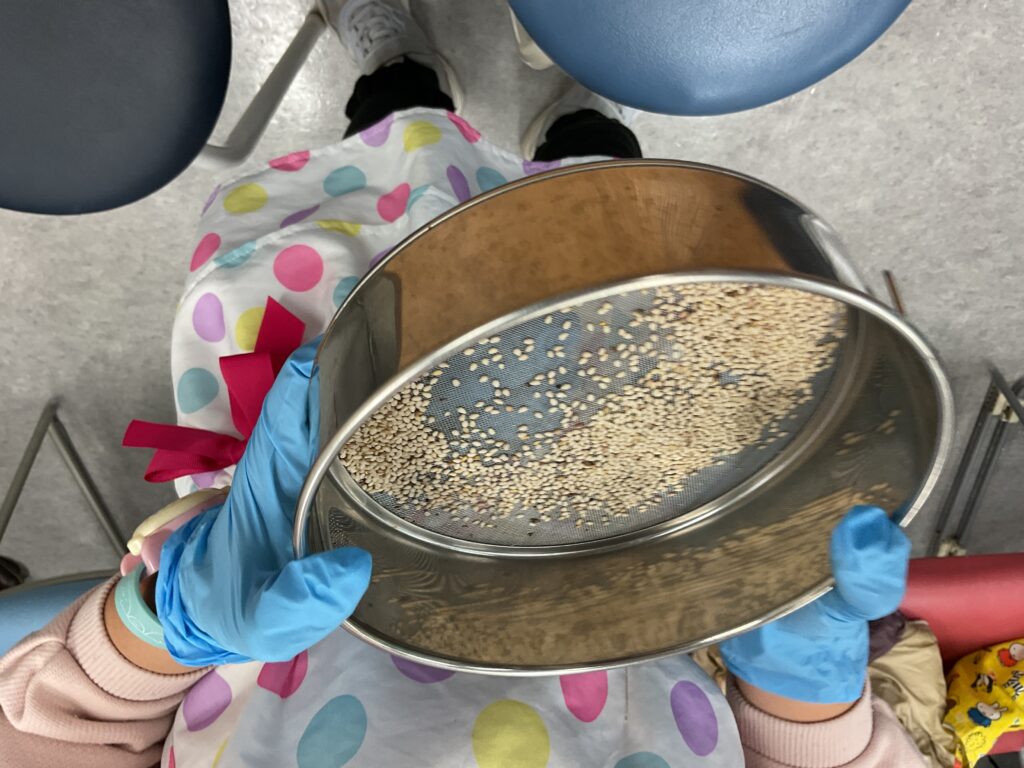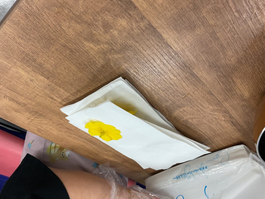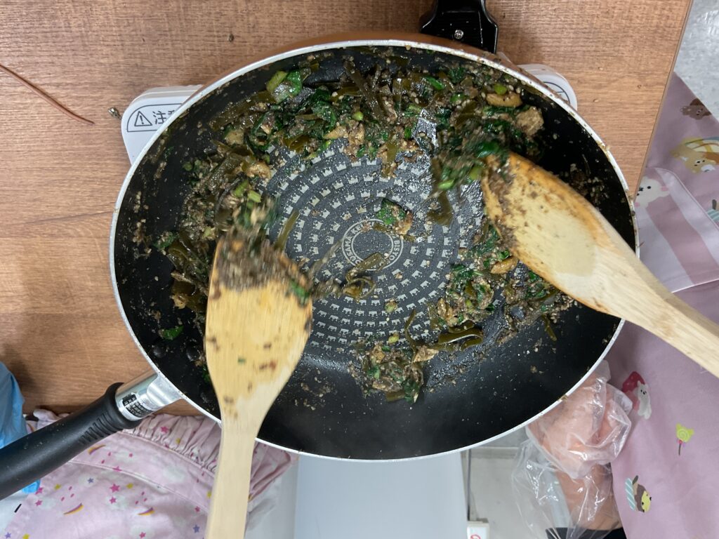 食材を細かく切る人、押し花を作る人、鍋の沸騰を見守る人、のらぼうと大根っ葉の違いを見極めて仕分ける人、のらぼうの葉をちぎる人、ゴマを炒る人、出汁ガラを炒めてふりかけを作る人。それぞれ分担をして、時々交替しながらみんなで協力してお味噌汁とふりかけを作り上げました。
