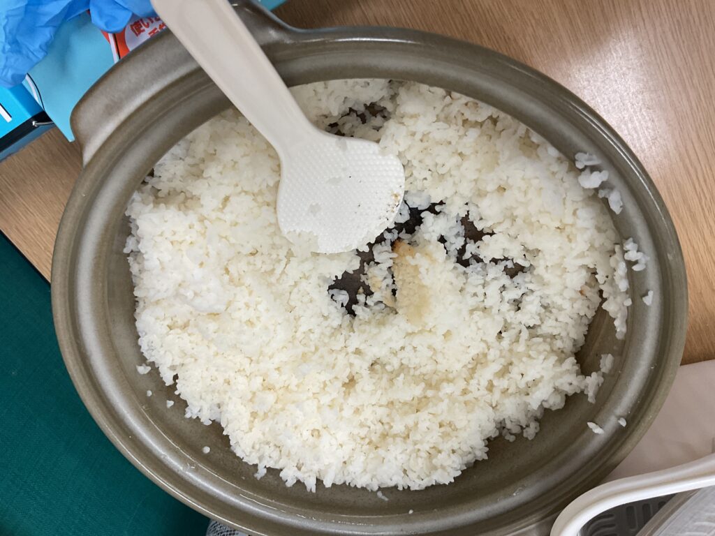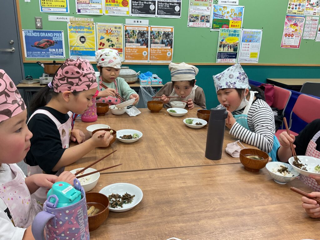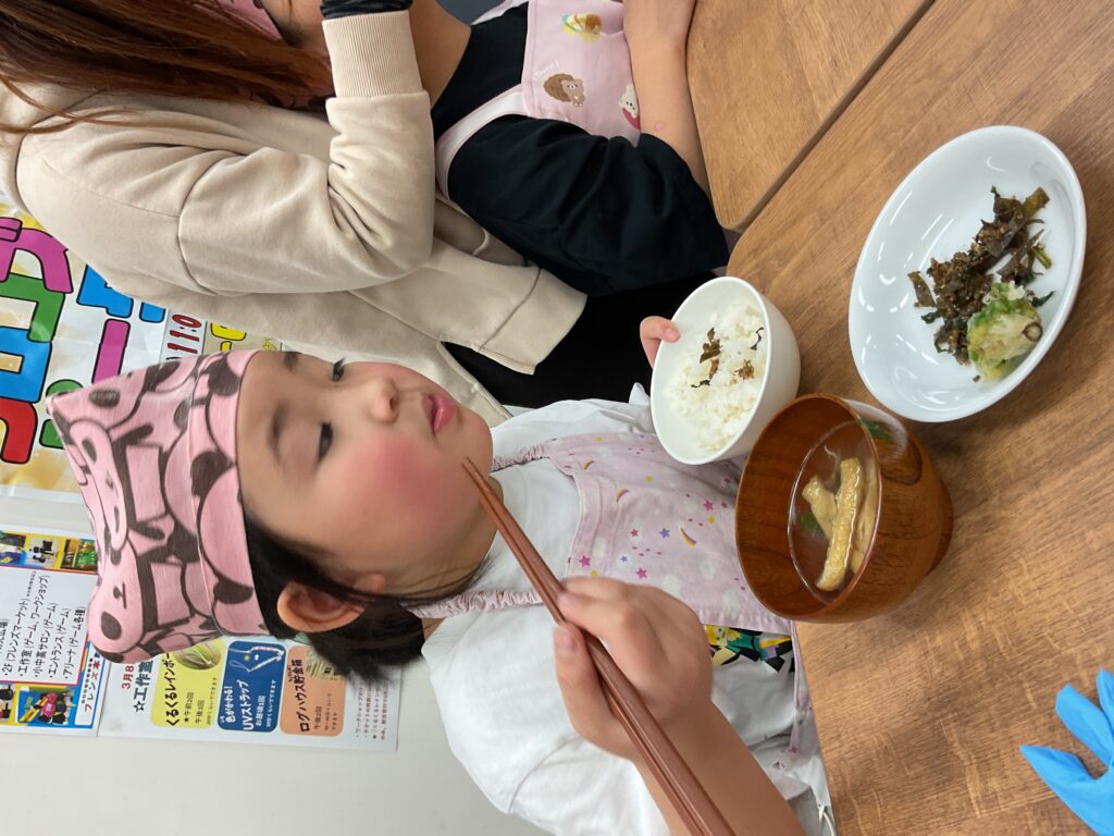 「ふりかけすっごくおいしい!」「ごはんもっちもち!もち米入っているみたい」「お味噌汁おいしい!あぶらあげに染み染み」「ごはんおかわり3回した!」「お味噌汁も3回おかわりした!」「ふきのとう最後にとっておいたの、うまっ」「お母さんに今来ればおこげ食べれるよって連絡した!だから待ってる!」「来年もつくろう!」と、みんなそれぞれ2回以上おかわりをして5合のお米とお味噌汁を平らげました。