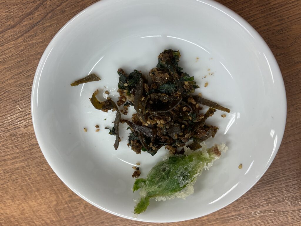 今日はほかに、土鍋炊きごはん、大根っ葉と出汁ガラとフレンズ産ゴマの手作りソフトふりかけ、フキノトウの天ぷらの献立です。