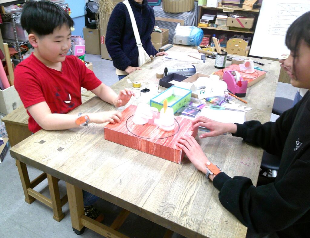 対戦する前に自分だけのおすもうを作りました。前へどんどん進むように調整しながら、相手を抑え込む手や飾りつけをしたら完成!