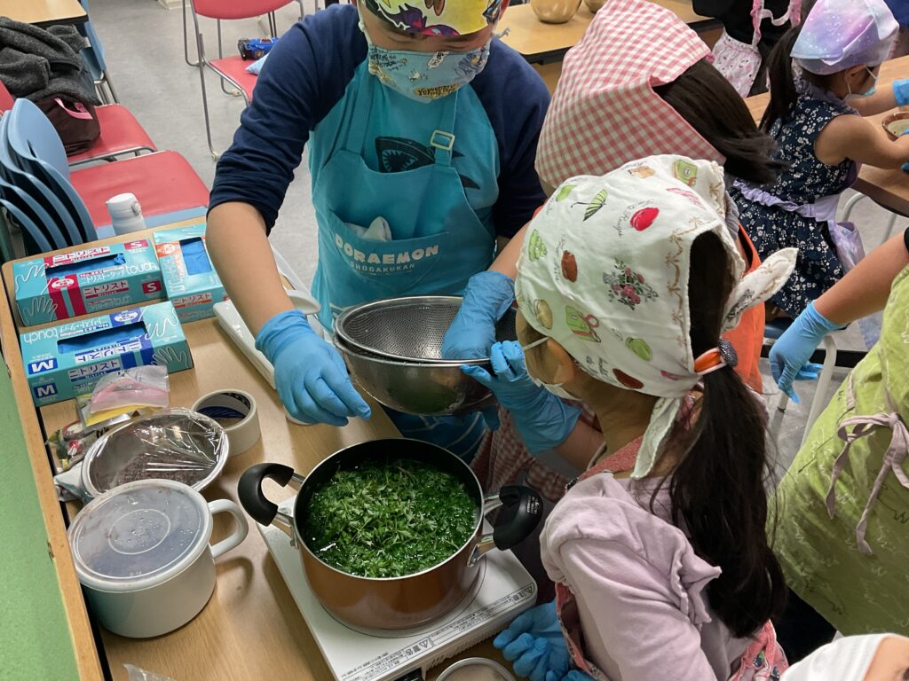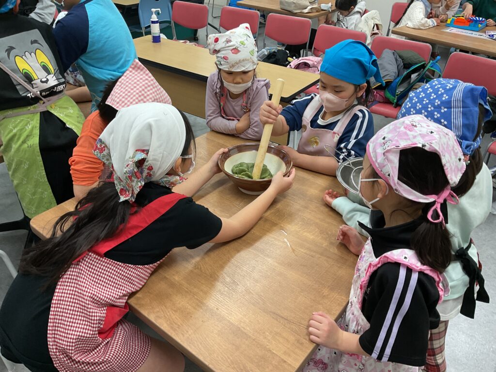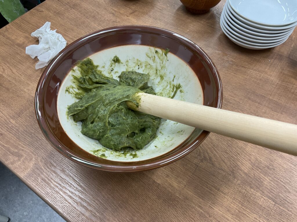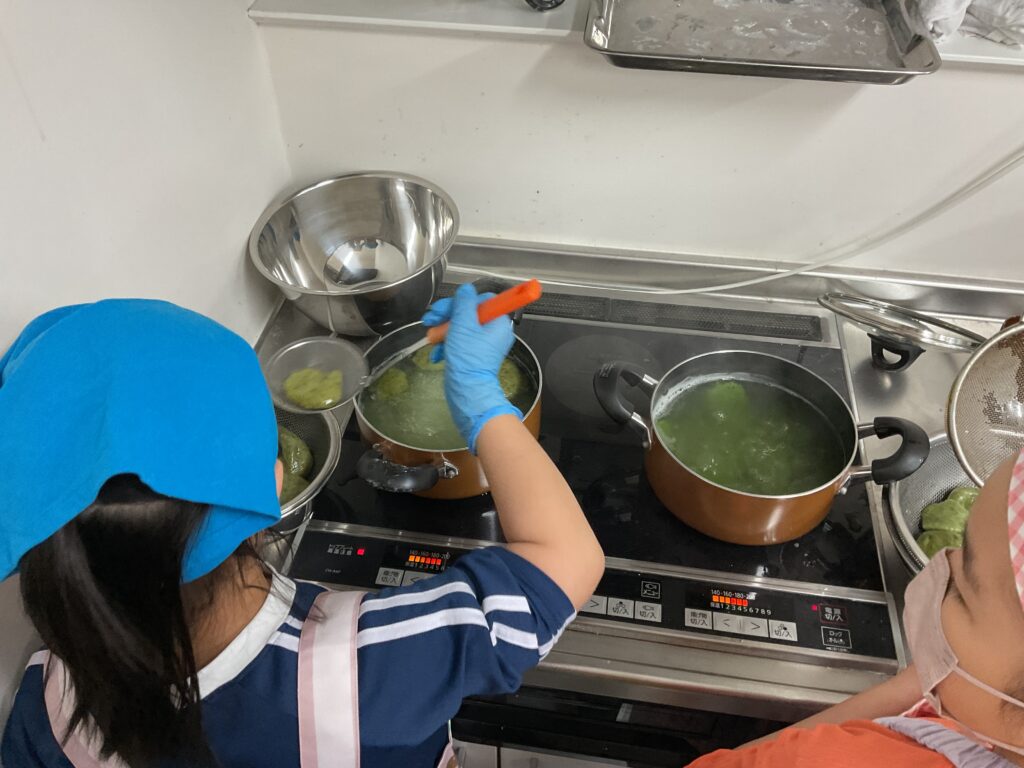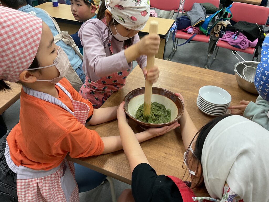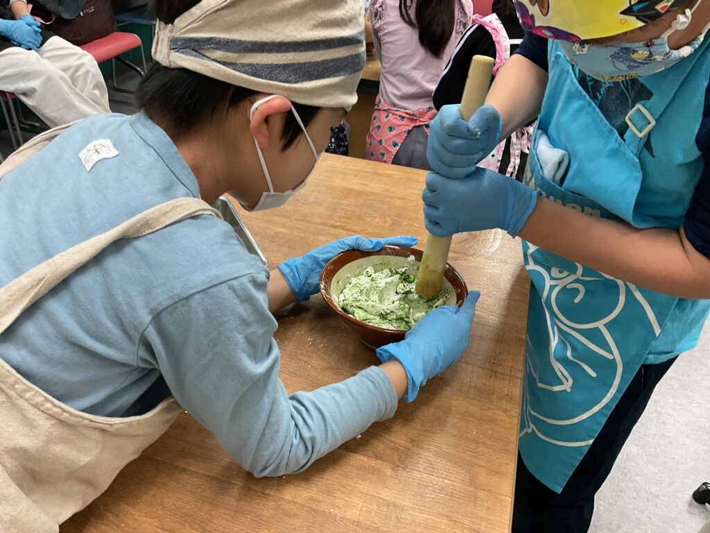 エプロンに包んでのヨモギ摘みや、調理の工程、食べる準備と、全ての工程をみんなで楽しんで挑戦していました。調理の工程そのものが楽しくて好きで参加をしている人もいましたよ。