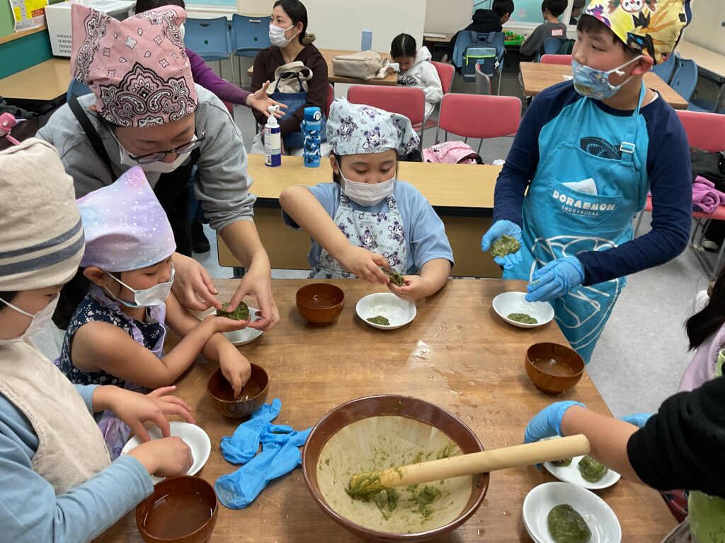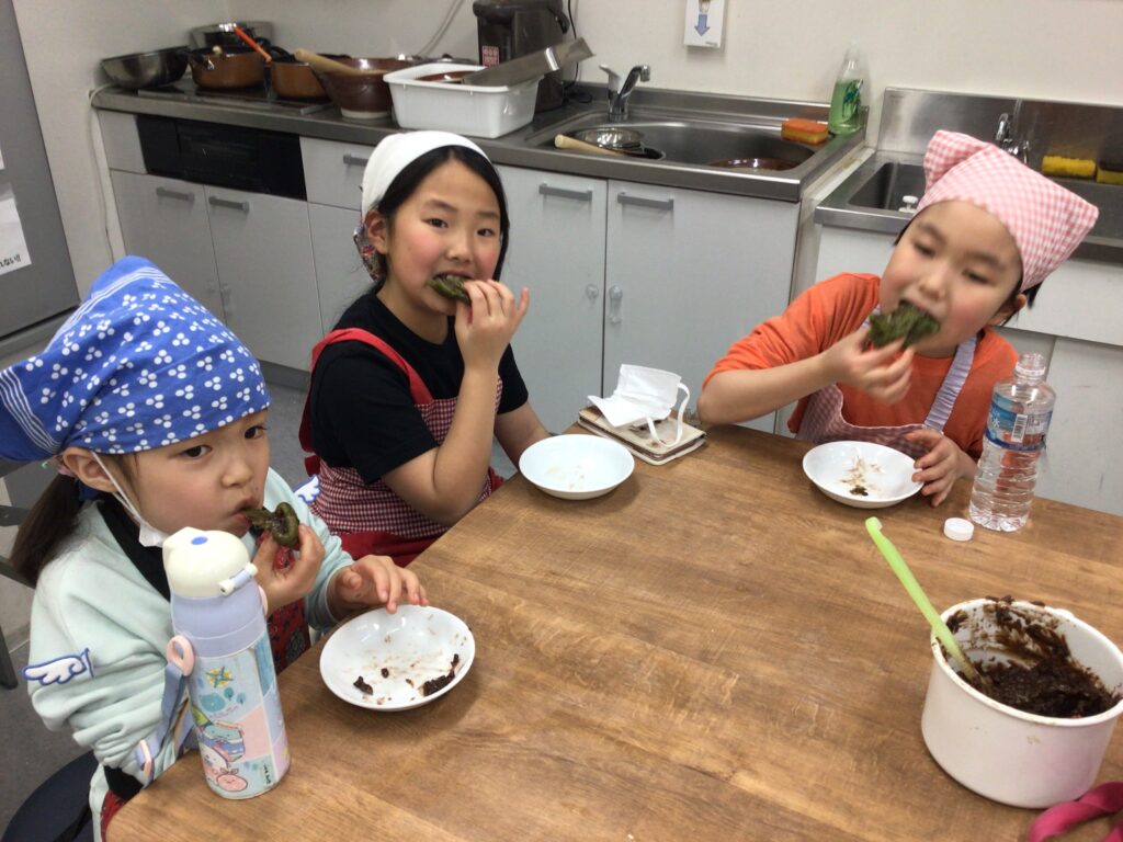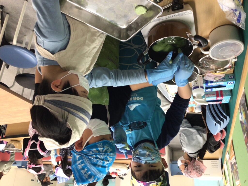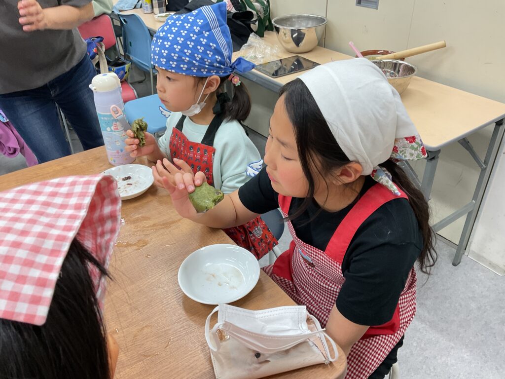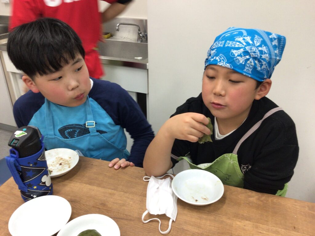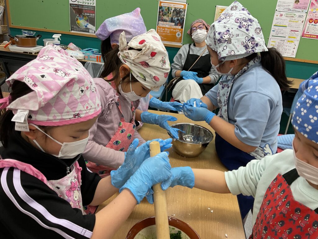 エプロンに包んでのヨモギ摘みや、調理の工程、食べる準備と、全ての工程をみんなで楽しんで挑戦していました。調理の工程そのものが楽しくて好きで参加をしている人もいましたよ。