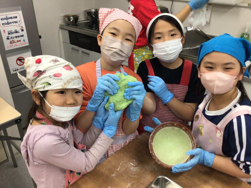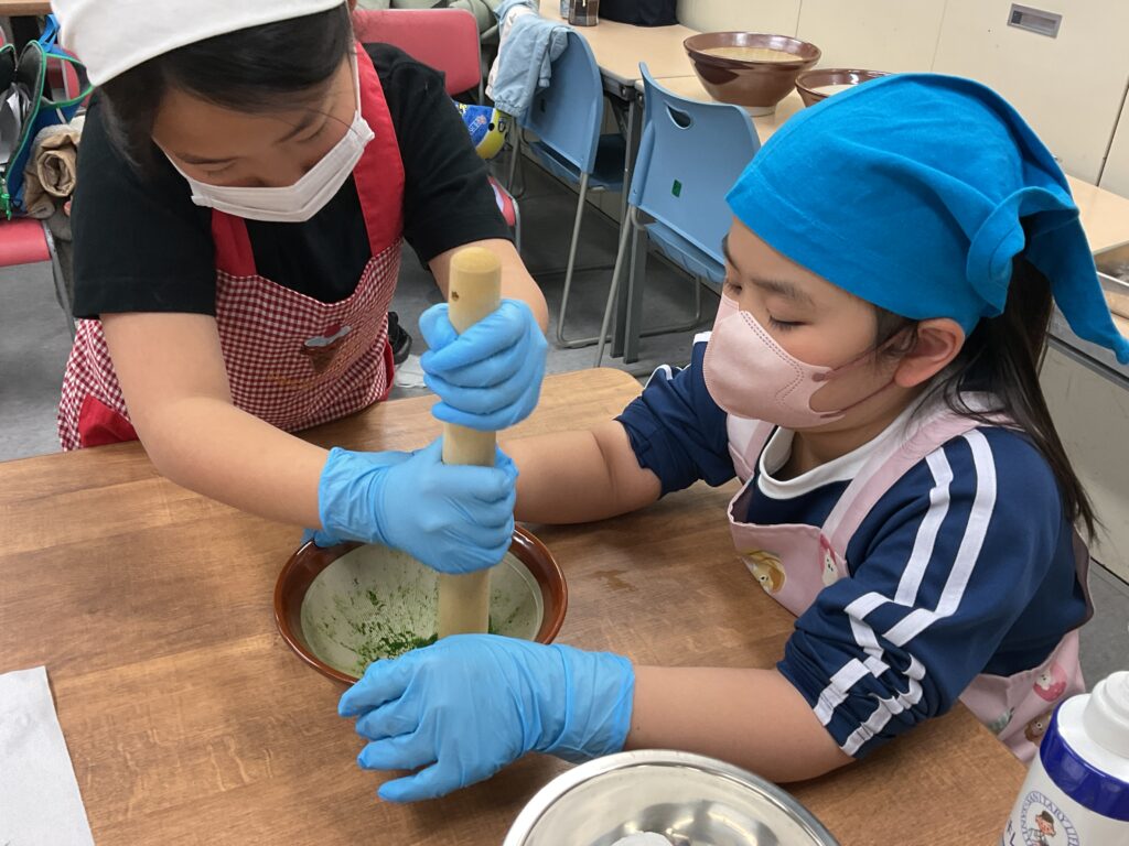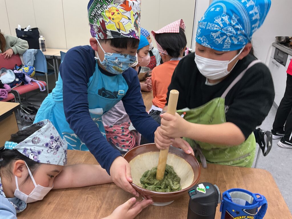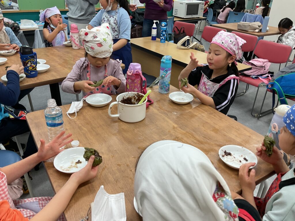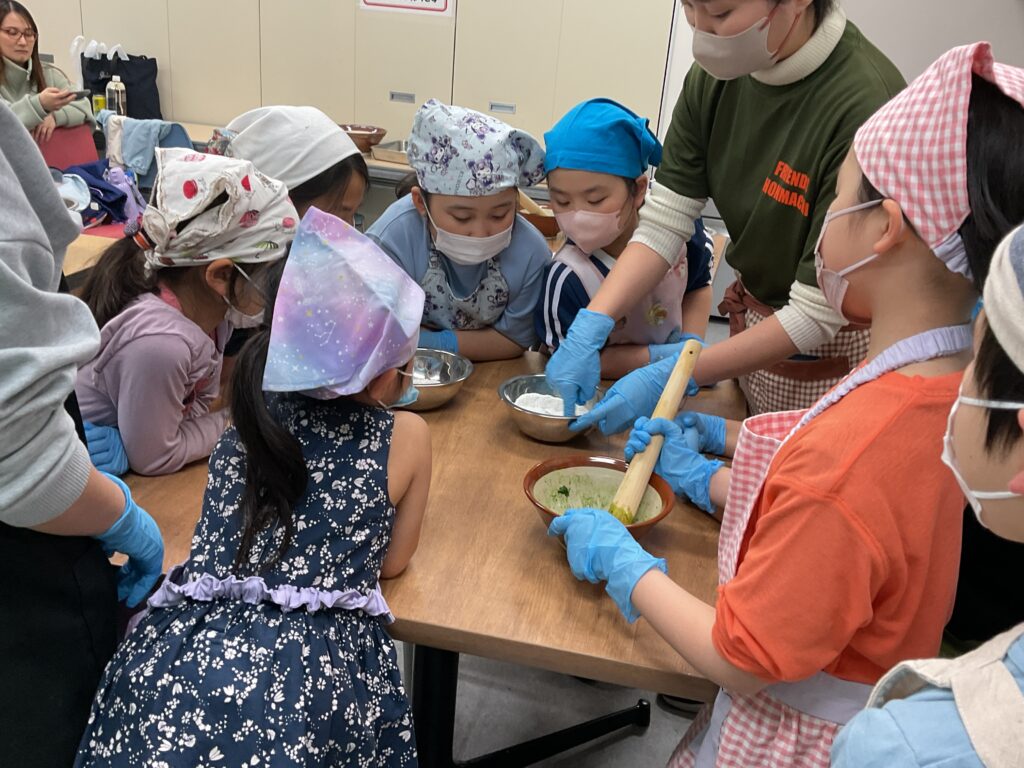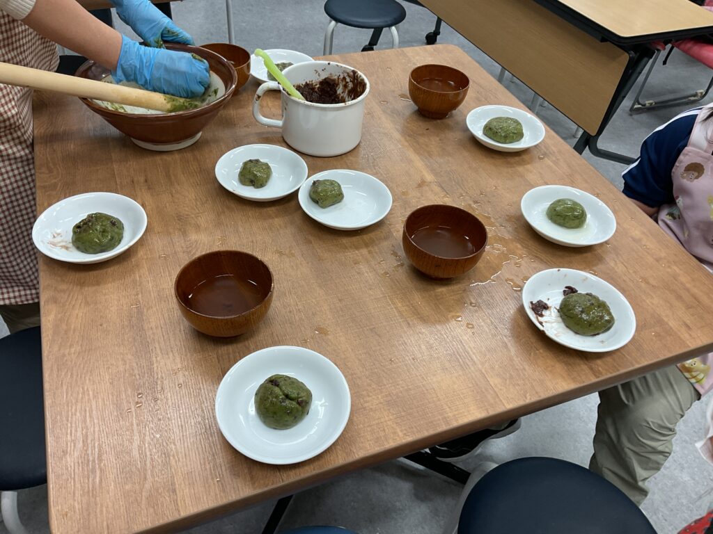 エプロンに包んでのヨモギ摘みや、調理の工程、食べる準備と、全ての工程をみんなで楽しんで挑戦していました。調理の工程そのものが楽しくて好きで参加をしている人もいましたよ。